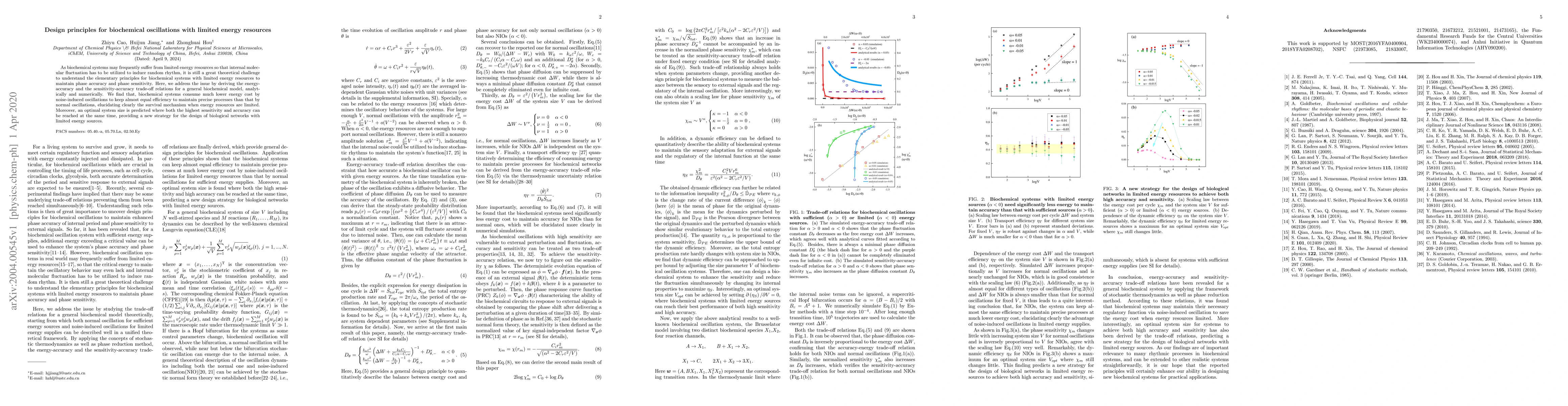 This paper explores the design principles for biochemical oscillations under limited energy resources, revealing that noise-induced oscillations enable efficient, precise processes with lower energy costs. It analytically and numerically identifies an optimal system size that maximizes both sensitivity and accuracy, offering a strategy for designing biological networks with minimal energy.