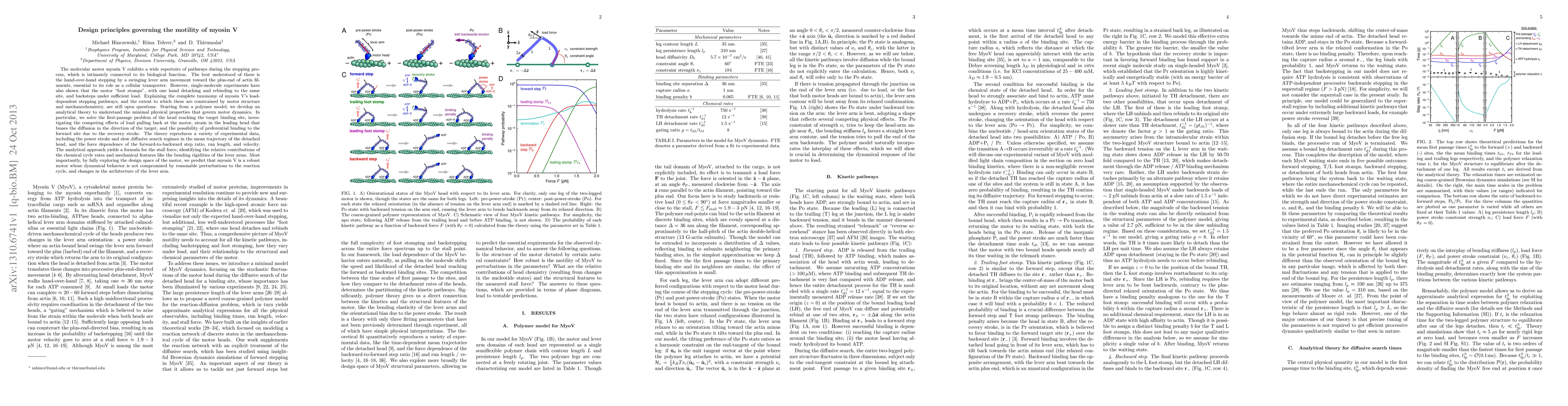 The molecular motor myosin V exhibits a wide repertoire of pathways during the stepping process, which is intimately connected to its biological function. The best understood of these is hand-over-hand stepping by a swinging lever arm movement toward the plus-end of actin filaments, essential to its role as a cellular transporter. However, single-molecule experiments have also shown that the motor "foot stomps", with one hand detaching and rebinding to the same site, and backsteps under sufficient load. Explaining the complete taxonomy of myosin V's load-dependent stepping pathways, and the extent to which these are constrained by motor structure and mechanochemistry, are still open questions. Starting from a polymer model, we develop an analytical theory to understand the minimal physical properties that govern motor dynamics. In particular, we solve the first-passage problem of the head reaching the target binding site, investigating the competing effects of load pulling back at the motor, strain in the leading head that biases the diffusion in the direction of the target, and the possibility of preferential binding to the forward site due to the recovery stroke. The theory reproduces a variety of experimental data, including the power stroke and slow diffusive search regimes in the mean trajectory of the detached head, and the force dependence of the forward-to-backward step ratio, run length, and velocity. The analytical approach yields a formula for the stall force, identifying the relative contributions of the chemical cycle rates and mechanical features like the bending rigidities of the lever arms. Most importantly, by fully exploring the design space of the motor, we predict that myosin V is a robust motor whose dynamical behavior is not compromised by reasonable perturbations to the reaction cycle, and changes in the architecture of the lever arm.