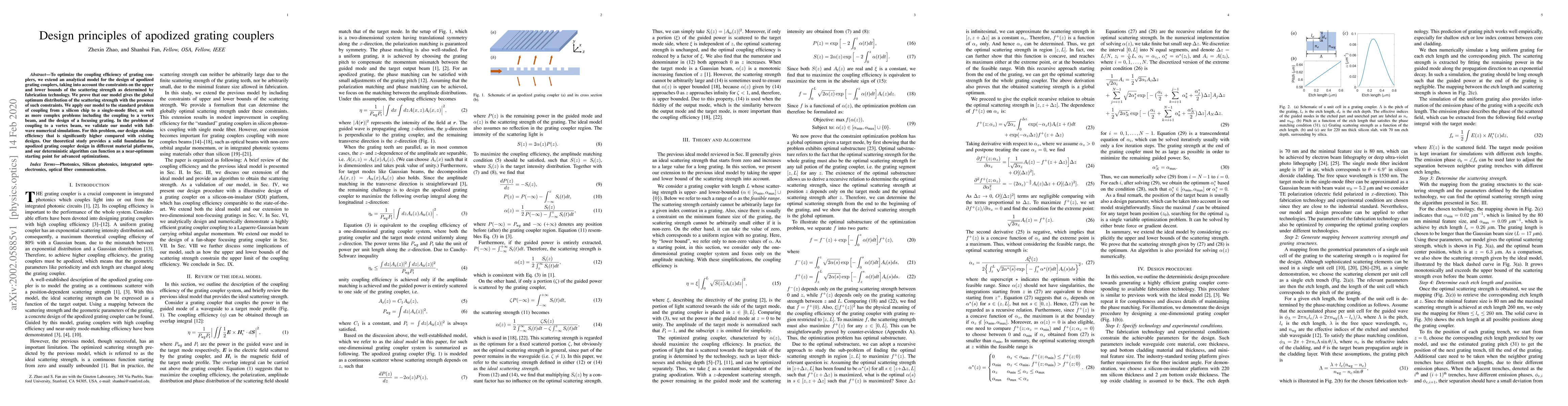 This paper presents an analytical model for optimizing the design of apodized grating couplers, achieving global optimum scattering strength distribution under fabrication constraints. The model is validated through full-wave simulations and shows significantly higher efficiency in coupling to vortex beams compared to existing designs.