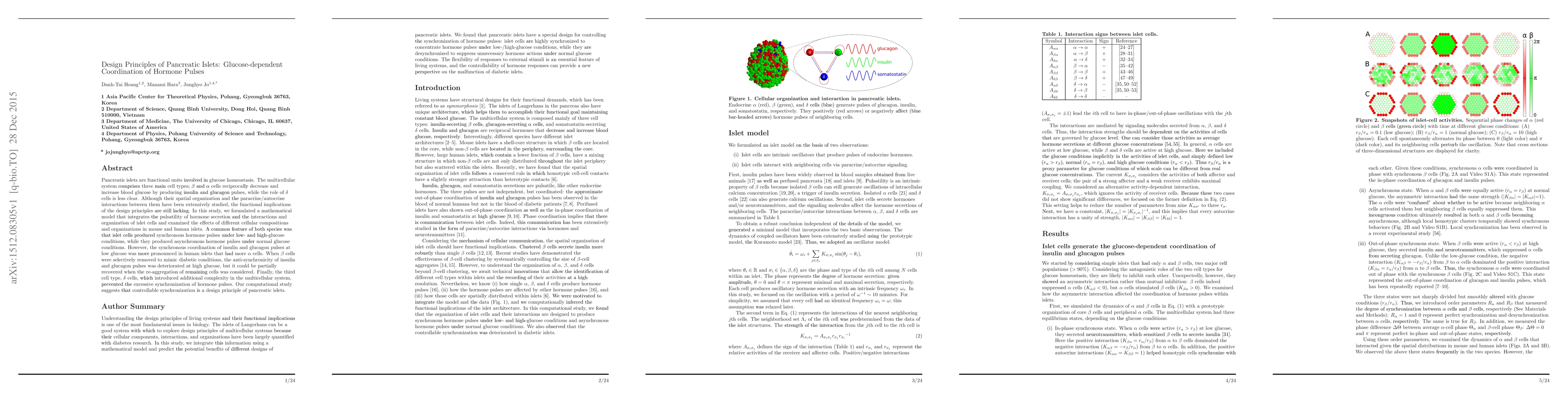This study develops a mathematical model to explore the design principles of pancreatic islets, revealing that hormone pulses are synchronous under low and high glucose levels but asynchronous under normal glucose conditions. The model highlights the role of $\alpha$ cells in enhancing synchronization in human islets and the mitigating effect of $\delta$ cells in preventing excessive synchronization.