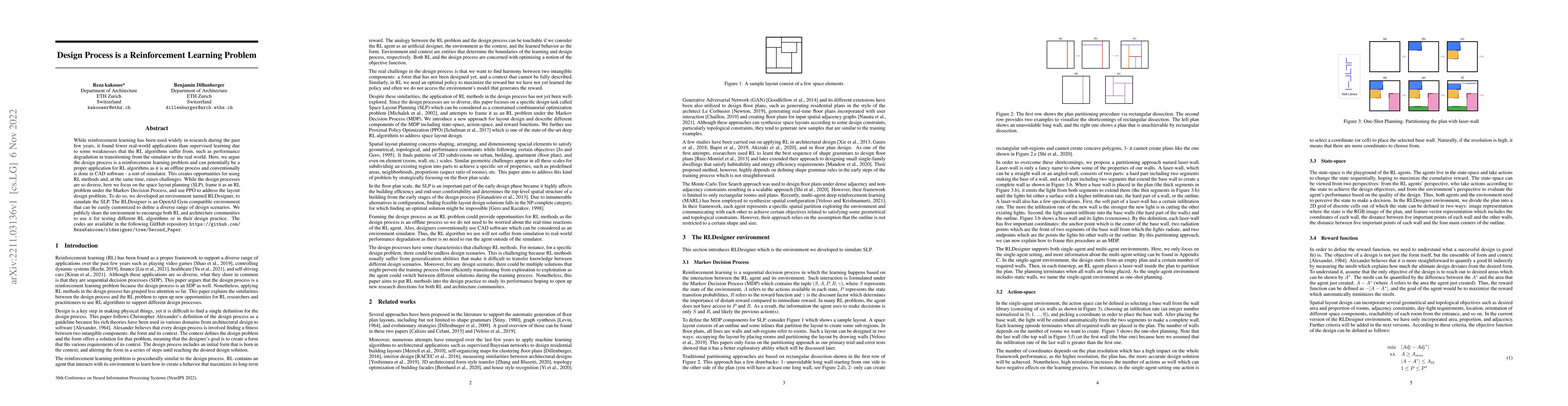 This paper argues that the design process, particularly space layout planning, can be framed as a reinforcement learning problem. The authors propose using PPO to tackle layout design within an RL framework and introduce RLDesigner, a customizable simulation environment compatible with the OpenAI Gym to facilitate testing of various RL algorithms in design scenarios.
