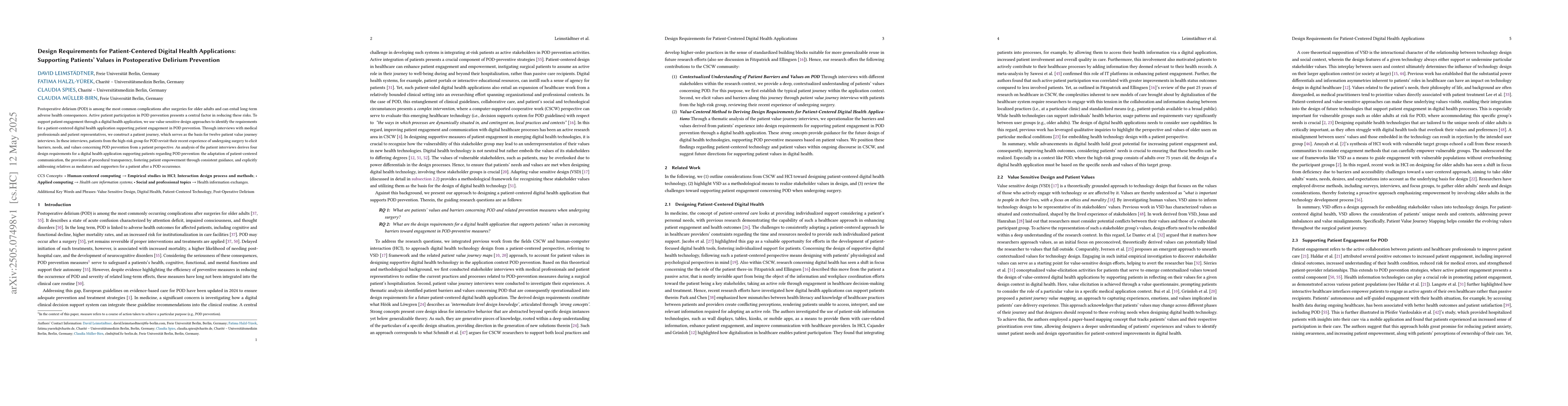 The paper presents four design requirements for a patient-centered digital health application aimed at supporting patients in postoperative delirium prevention.