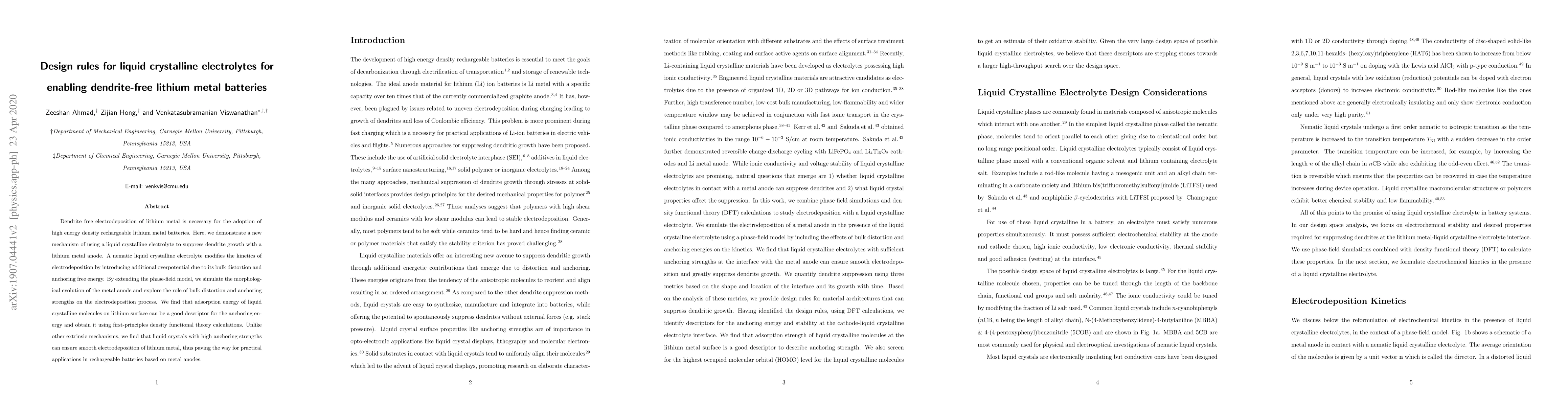 This research develops a liquid crystalline electrolyte to suppress lithium dendrite growth in rechargeable lithium metal batteries. Simulations and density functional theory reveal that high anchoring strengths in liquid crystals effectively promote smooth electrodeposition, offering a promising solution for high energy density batteries.