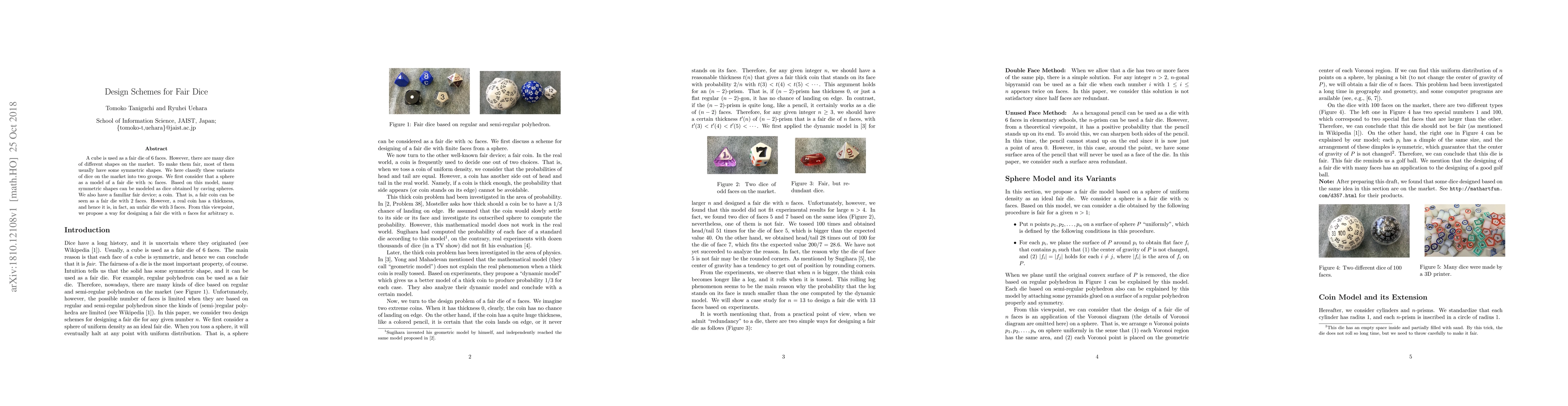 A cube is used as a fair die of 6 faces. However, there are many dice of different shapes on the market. To make them fair, most of them usually have some symmetric shapes. We here classify these variants of dice on the market into two groups. We first consider that a sphere as a model of a fair die with infinity faces. Based on this model, many symmetric shapes can be modeled as dice obtained by caving spheres. We also have a familiar fair device; a coin. That is, a fair coin can be seen as a fair die with 2 faces. However, a real coin has a thickness, and hence it is, in fact, an unfair die with 3 faces. From this viewpoint, we propose a way for designing a fair die with n faces for arbitrary n.