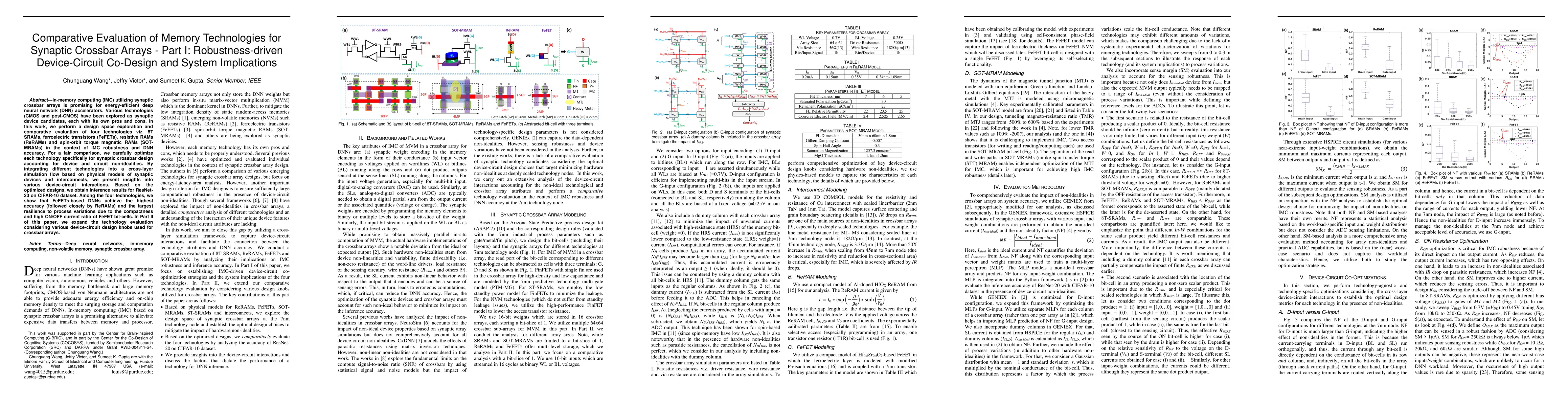 This paper explores and compares various memory technologies for synaptic crossbar arrays in in-memory computing, optimizing them for device-circuit non-idealities and system accuracy. FeFET-based crossbars achieve the highest accuracy due to their favorable properties, as demonstrated through ResNet-20 inference on CIFAR-10.