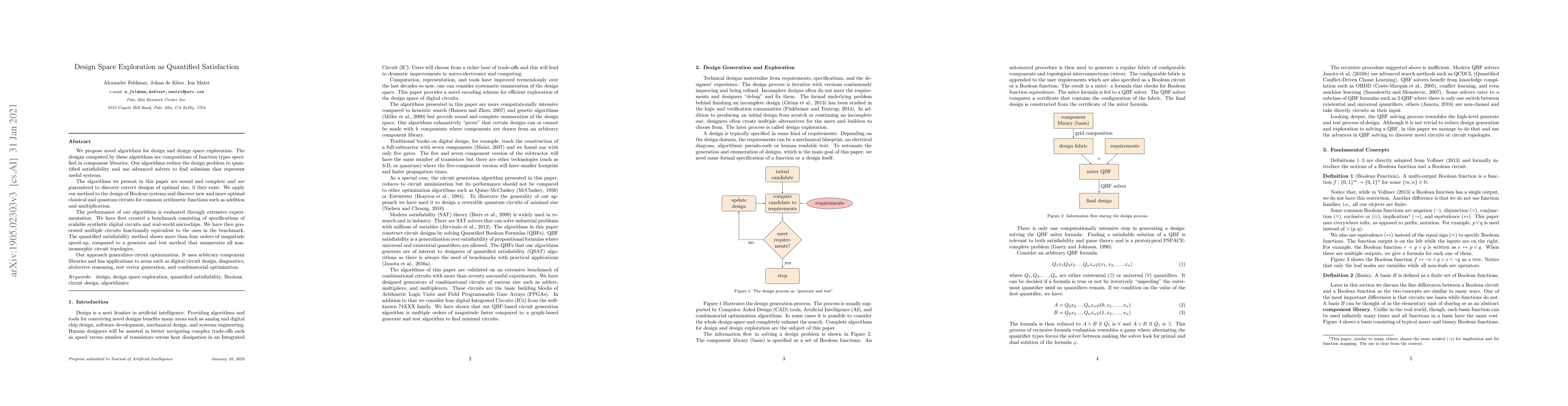 We present novel algorithms for design and design space exploration. The designs discovered by these algorithms are compositions of function types specified in component libraries. Our algorithms reduce the design problem to quantified satisfiability and use advanced solvers to find solutions that represent useful systems. The algorithms we present in this paper are sound and complete and are guaranteed to discover correct designs of optimal size, if they exist. We apply our method to the design of Boolean systems and discover new and more optimal classical digital and quantum circuits for common arithmetic functions such as addition and multiplication. The performance of our algorithms is evaluated through extensive experimentation. We created a benchmark consisting of specifications of scalable synthetic digital circuits and real-world mirochips. We have generated multiple circuits functionally equivalent to the ones in the benchmark. The quantified satisfiability method shows more than four orders of magnitude speed-up, compared to a generate and test method that enumerates all non-isomorphic circuit topologies. Our approach generalizes circuit optimization. It uses arbitrary component libraries and has applications to areas such as digital circuit design, diagnostics, abductive reasoning, test vector generation, and combinatorial optimization.