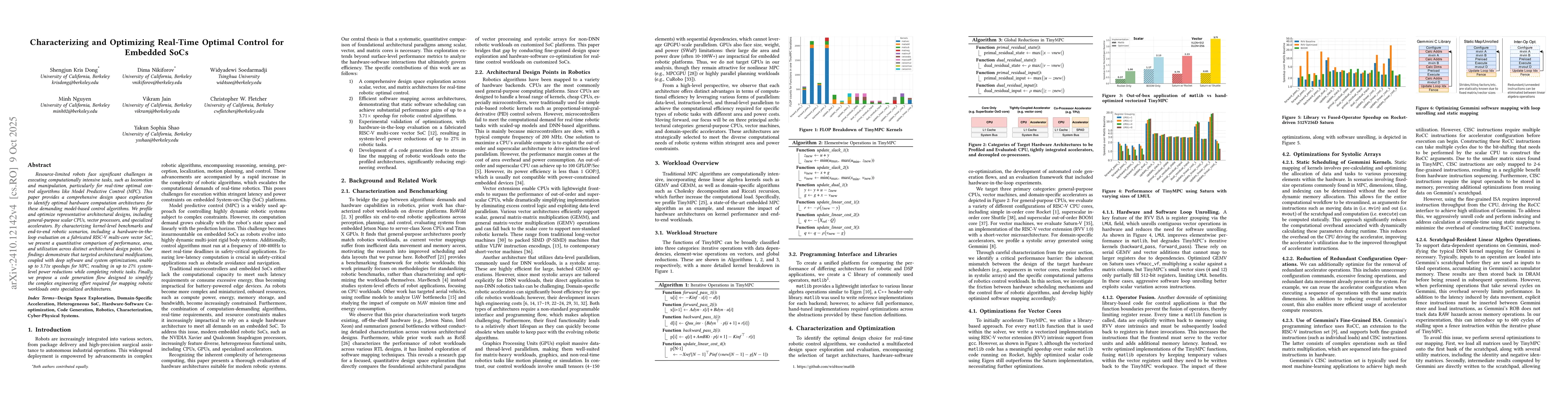 This research explores various embedded System-on-Chip (SoC) architectures for real-time optimal control in resource-limited robots, comparing CPUs, vector processors, and specialized accelerators to identify the best fit for model-based control algorithms. The study concludes that optimized architectural modifications, software, and system enhancements can improve performance and utilization, proposing a simplified code generation method for robotic workloads.