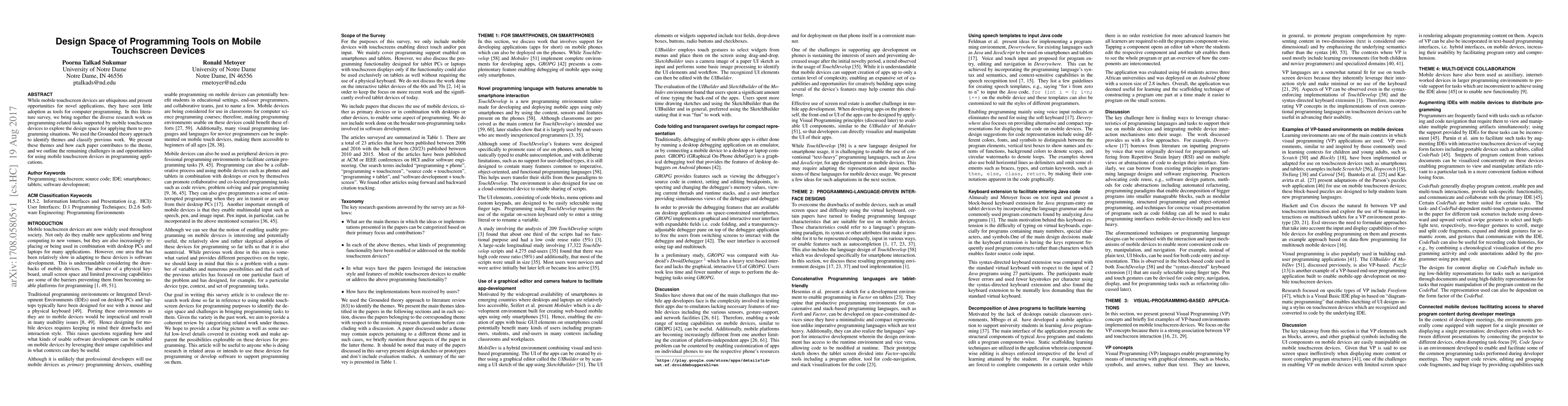 This paper surveys research on programming tools for mobile touchscreen devices, using grounded theory to categorize contributions and identify challenges. It highlights opportunities for leveraging these devices in programming while noting remaining gaps and issues.