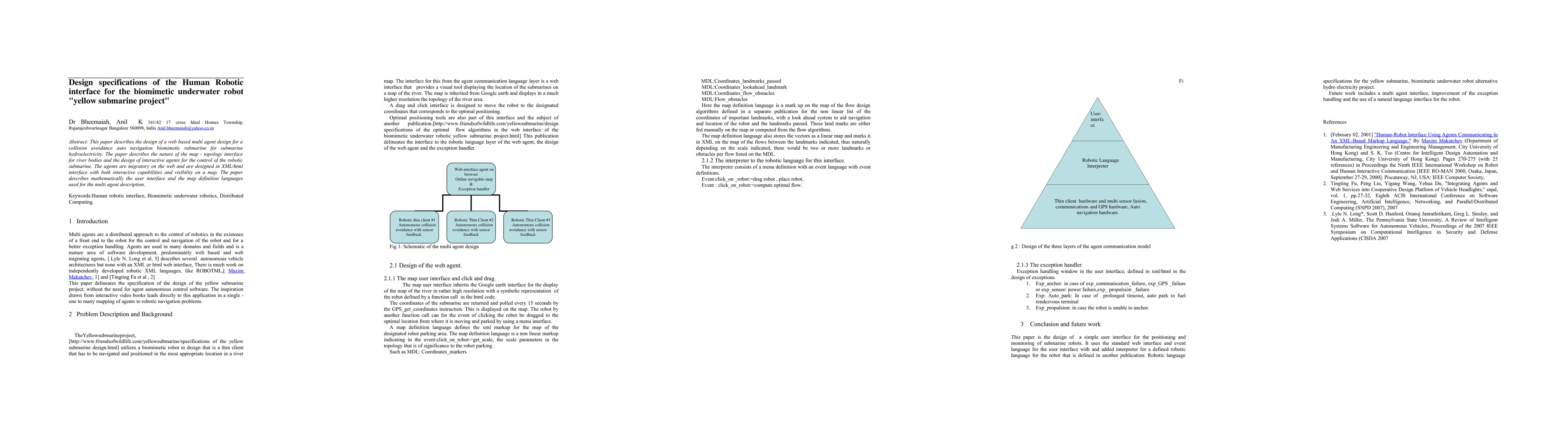 This paper describes the design of a web based multi agent design for a collision avoidance auto navigation biomimetic submarine for submarine hydroelectricity. The paper describes the nature of the map - topology interface for river bodies and the design of interactive agents for the control of the robotic submarine. The agents are migratory on the web and are designed in XML/html interface with both interactive capabilities and visibility on a map. The paper describes mathematically the user interface and the map definition languages used for the multi agent description
