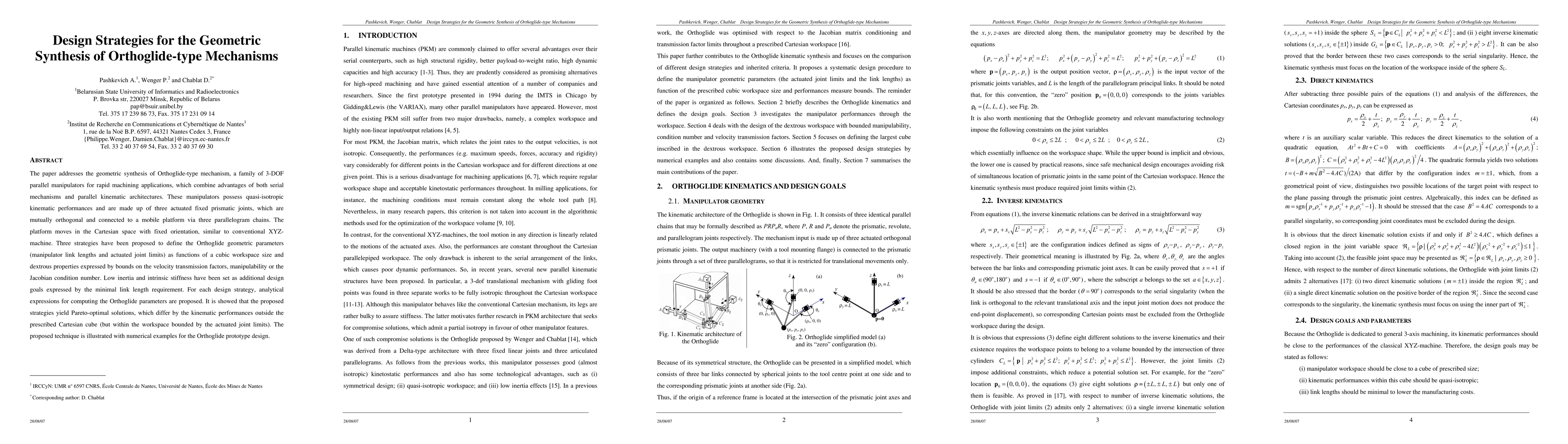 The paper addresses the geometric synthesis of Orthoglide-type mechanism, a family of 3-DOF parallel manipulators for rapid machining applications, which combine advantages of both serial mechanisms and parallel kinematic architectures. These manipulators possess quasi-isotropic kinematic performances and are made up of three actuated fixed prismatic joints, which are mutually orthogonal and connected to a mobile platform via three parallelogram chains. The platform moves in the Cartesian space with fixed orientation, similar to conventional XYZ-machine. Three strategies have been proposed to define the Orthoglide geometric parameters (manipulator link lengths and actuated joint limits) as functions of a cubic workspace size and dextrous properties expressed by bounds on the velocity transmission factors, manipulability or the Jacobian condition number. Low inertia and intrinsic stiffness have been set as additional design goals expressed by the minimal link length requirement. For each design strategy, analytical expressions for computing the Orthoglide parameters are proposed. It is showed that the proposed strategies yield Pareto-optimal solutions, which differ by the kinematic performances outside the prescribed Cartesian cube (but within the workspace bounded by the actuated joint limits). The proposed technique is illustrated with numerical examples for the Orthoglide prototype design.