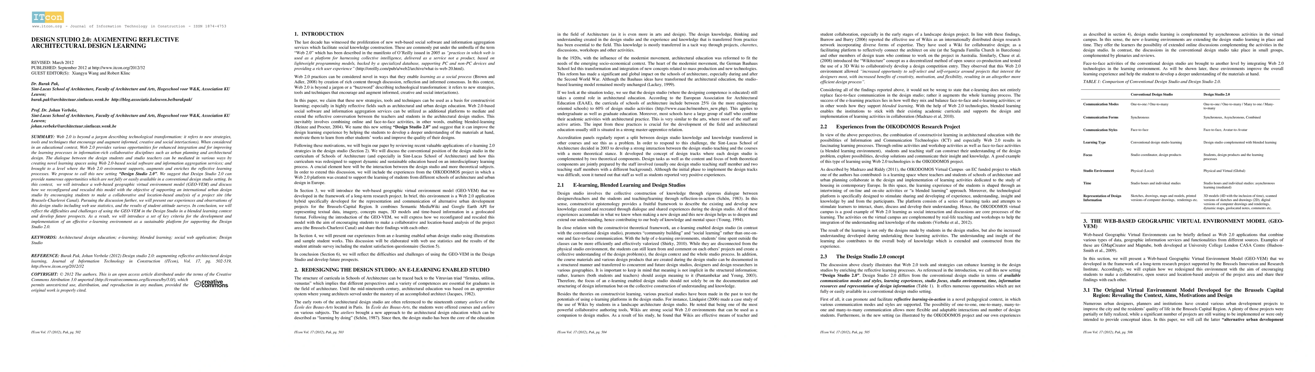 Web 2.0 is beyond a jargon describing technological transformation: it refers to new strategies, tools and techniques that encourage and augment informed, creative and social inter(actions). When considered in an educational context, Web 2.0 provides various opportunities for enhanced integration and for improving the learning processes in information-rich collaborative disciplines such as urban planning and architectural design. The dialogue between the design students and studio teachers can be mediated in various ways by creating novel learning spaces using Web 2.0-based social software and information aggregation services, and brought to a level where the Web 2.0 environment supports, augments and enriches the reflective learning processes. We propose to call this new setting Design Studio 2.0. We suggest that Design Studio 2.0 can provide numerous opportunities which are not fully or easily available in a conventional design studio setting. In this context, we will introduce a web-based geographic virtual environment model (GEO-VEM) and discuss how we reconfigured and rescaled this model with the objective of supporting an international urban design studio by encouraging students to make a collaborative and location-based analysis of a project site (the Brussels-Charleroi Canal). Pursuing the discussion further, we will present our experiences and observations of this design studio including web use statistics, and the results of student attitude surveys. In conclusion, we will reflect the difficulties and challenges of using the GEO-VEM in the Design Studio in a blended learning context and develop future prospects. As a result, we will introduce a set of key criteria for the development and implementation of an effective e-learning environment as a sustainable platform for supporting the Design Studio 2.0.
