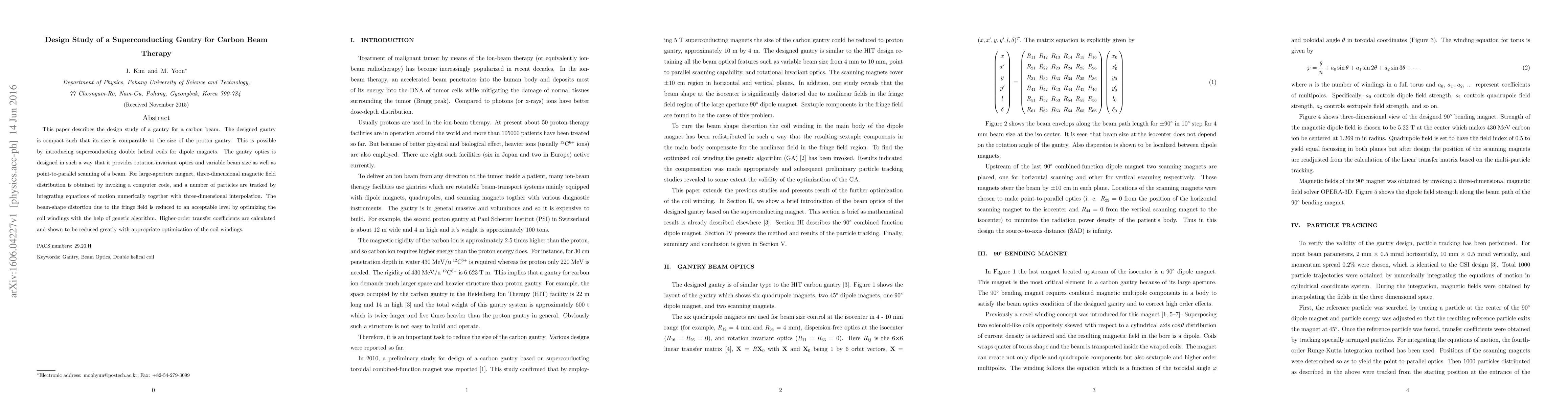 This paper describes the design study of a gantry for a carbon beam. The designed gantry is compact such that its size is comparable to the size of the proton gantry. This is possible by introducing superconducting double helical coils for dipole magnets. The gantry optics is designed in such a way that it provides rotation-invariant optics and variable beam size as well as point-to-parallel scanning of a beam. For large-aperture magnet, three-dimensional magnetic field distribution is obtained by invoking a computer code, and a number of particles are tracked by integrating equations of motion numerically together with three-dimensional interpolation. The beam-shape distortion due to the fringe field is reduced to an acceptable level by optimizing the coil windings with the help of genetic algorithm. Higher-order transfer coefficients are calculated and shown to be reduced greatly with appropriate optimization of the coil windings.