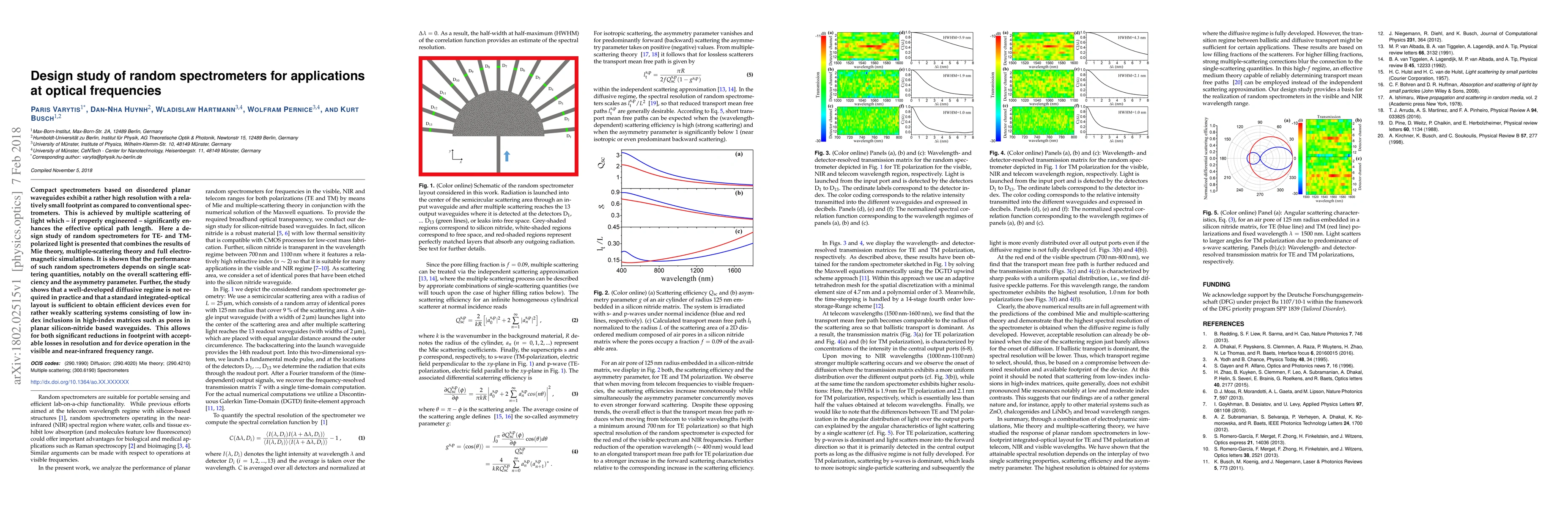 Compact spectrometers based on disordered planar waveguides exhibit a rather high resolution with a relatively small footprint as compared to conventional spectrometers. This is achieved by multiple scattering of light which - if properly engineered - significantly enhances the effective optical path length. Here a design study of random spectrometers for TE- and TM-polarized light is presented that combines the results of Mie theory, multiple-scattering theory and full electromagnetic simulations. It is shown that the performance of such random spectrometers depends on single scattering quantities, notably on the overall scattering efficiency and the asymmetry parameter. Further, the study shows that a well-developed diffusive regime is not required in practice and that a standard integrated-optical layout is sufficient to obtain efficient devices even for rather weakly scattering systems consisting of low index inclusions in high-index matrices such as pores in planar silicon-nitride based waveguides. This allows for both significant reductions in footprint with acceptable losses in resolution and for device operation in the visible and near-infrared frequency range.