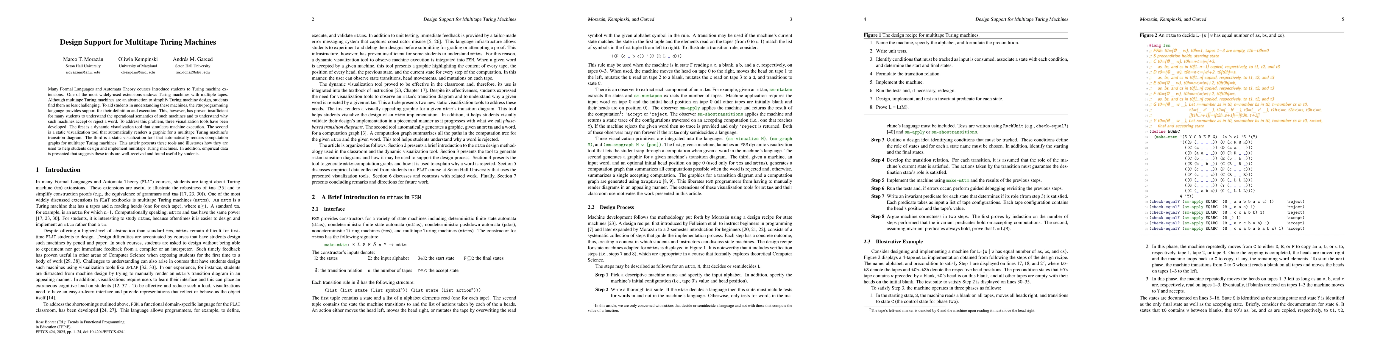 Many Formal Languages and Automata Theory courses introduce students to Turing machine extensions. One of the most widely-used extensions endows Turing machines with multiple tapes. Although multitape Turing machines are an abstraction to simplify Turing machine design, students find them no less challenging. To aid students in understanding these machines, the FSM programming language provides support for their definition and execution. This, however, has proven insufficient for many students to understand the operational semantics of such machines and to understand why such machines accept or reject a word. To address this problem, three visualization tools have been developed. The first is a dynamic visualization tool that simulates machine execution. The second is a static visualization tool that automatically renders a graphic for a multitape Turing machine's transition diagram. The third is a static visualization tool that automatically renders computation graphs for multitape Turing machines. This article presents these tools and illustrates how they are used to help students design and implement multitape Turing machines. In addition, empirical data is presented that suggests these tools are well-received and found useful by students.