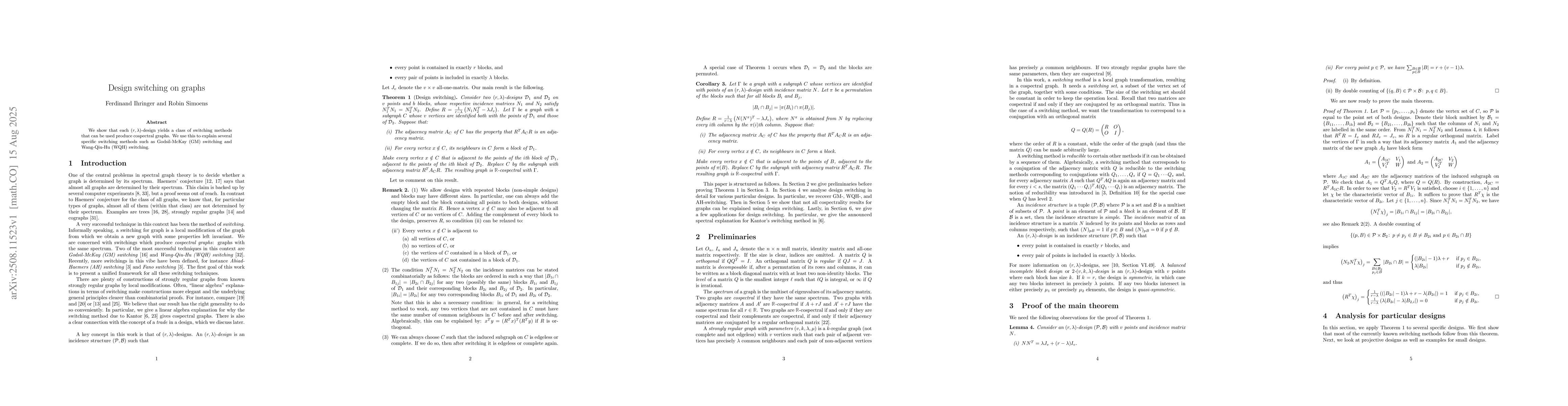 We show that each (r, lambda)-design yields a class of switching methods that can be used produce cospectral graphs. We use this to explain several specific switching methods such as Godsil-McKay (GM) switching and Wang-Qiu-Hu (WQH) switching.