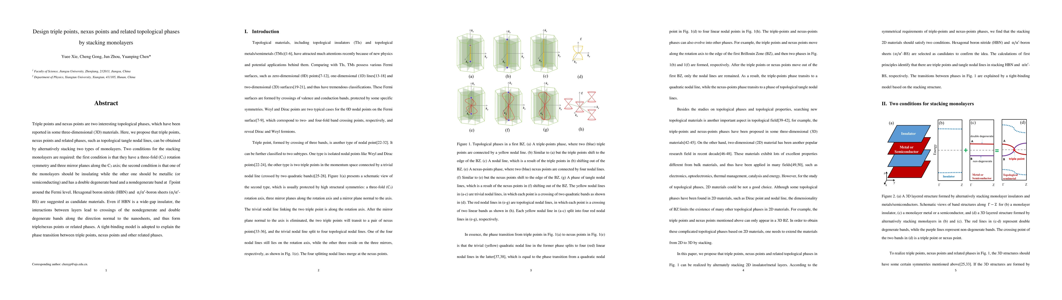 This paper proposes that triple points, nexus points, and related topological phases can be achieved by stacking monolayers with specific symmetries and band structures. The required conditions include three-fold rotation symmetry and distinct insulating and metallic/semiconducting monolayers, with suggested candidates like hexagonal boron nitride and boron sheets.