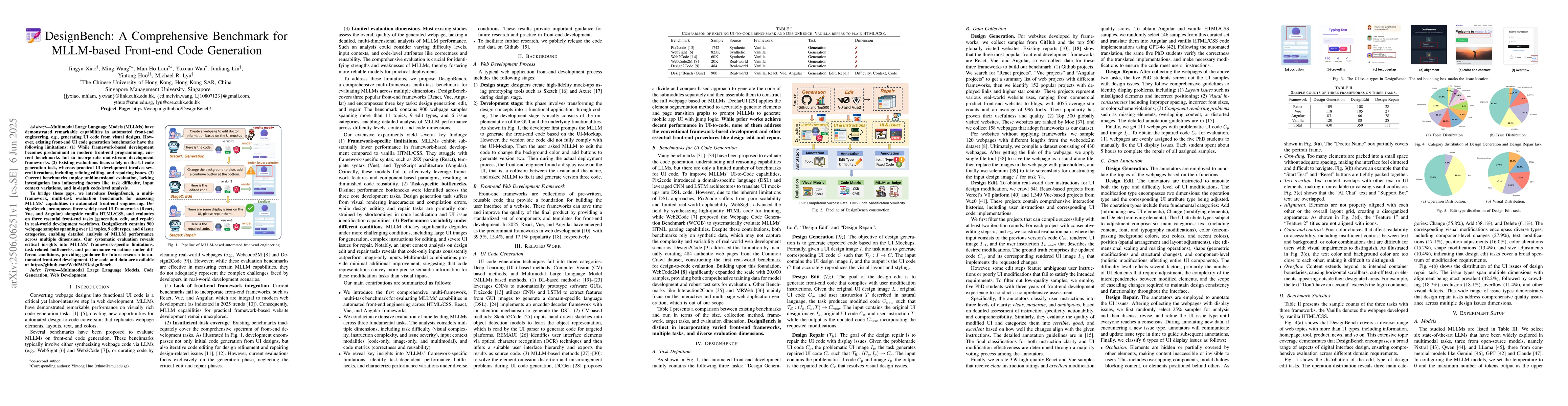DesignBench introduces a comprehensive benchmark for MLLM-based front-end code generation, evaluating three frameworks and three tasks with 900 webpage samples, revealing framework-specific limitations and performance variations.