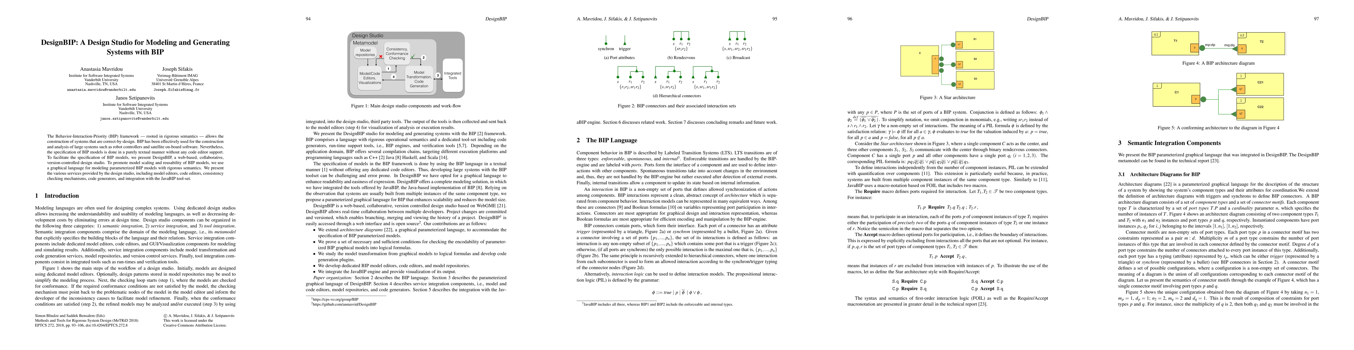 DesignBIP is a web-based design studio for creating and managing BIP models with graphical and textual support, enhancing code editors and consistency checking to facilitate large system modeling and reuse. It integrates with JavaBIP tools for generating code and maintaining version control.