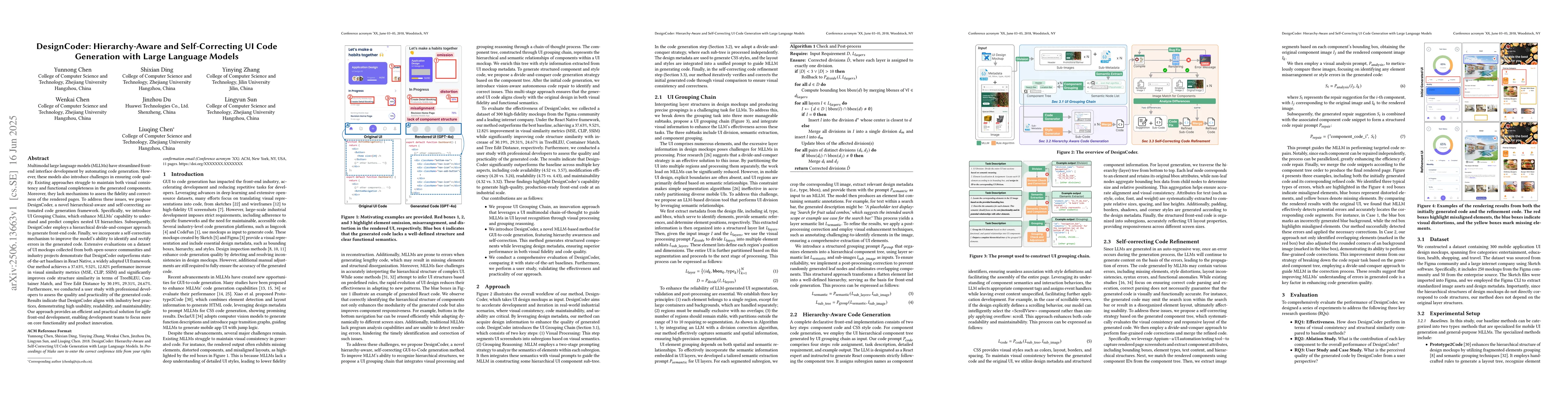 DesignCoder is a new framework that improves UI code generation using large language models. It introduces UI Grouping Chains for understanding complex UI structures and a self-correction mechanism for error rectification. Evaluations show DesignCoder outperforms existing methods in visual similarity and code structure, aligning with industry best practices for usability, readability, and maintainability, thus aiding efficient front-end development.