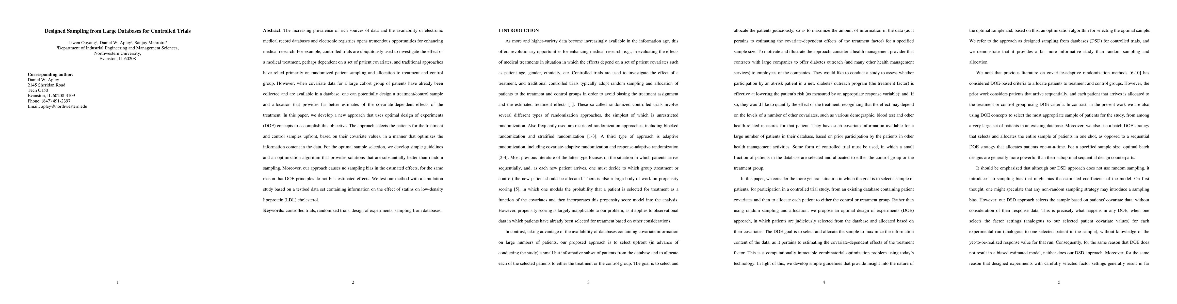 The increasing prevalence of rich sources of data and the availability of electronic medical record databases and electronic registries opens tremendous opportunities for enhancing medical research. For example, controlled trials are ubiquitously used to investigate the effect of a medical treatment, perhaps dependent on a set of patient covariates, and traditional approaches have relied primarily on randomized patient sampling and allocation to treatment and control group. However, when covariate data for a large cohort group of patients have already been collected and are available in a database, one can potentially design a treatment/control sample and allocation that provides far better estimates of the covariate-dependent effects of the treatment. In this paper, we develop a new approach that uses optimal design of experiments (DOE) concepts to accomplish this objective. The approach selects the patients for the treatment and control samples upfront, based on their covariate values, in a manner that optimizes the information content in the data. For the optimal sample selection, we develop simple guidelines and an optimization algorithm that provides solutions that are substantially better than random sampling. Moreover, our approach causes no sampling bias in the estimated effects, for the same reason that DOE principles do not bias estimated effects. We test our method with a simulation study based on a testbed data set containing information on the effect of statins on low-density lipoprotein (LDL) cholesterol.