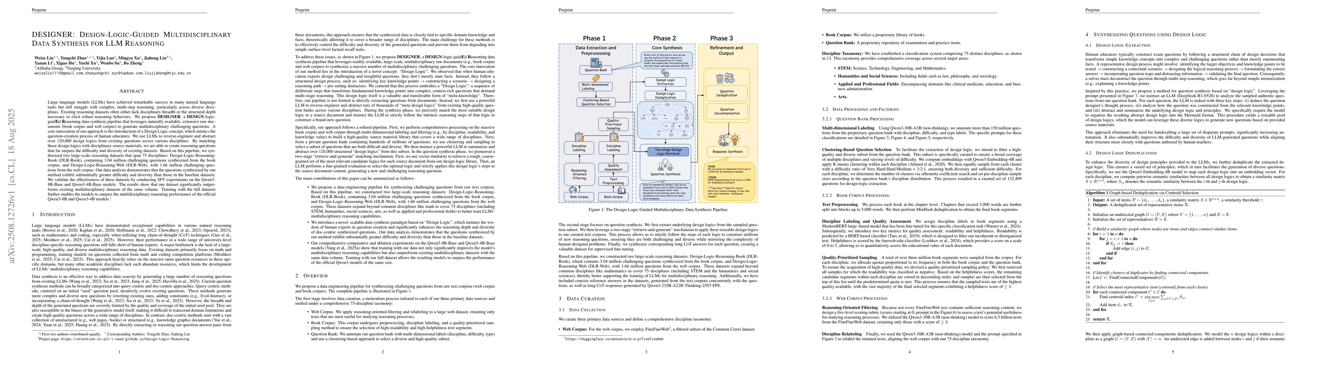 Large language models (LLMs) have achieved remarkable success in many natural language tasks but still struggle with complex, multi-step reasoning, particularly across diverse disciplines. Existing reasoning datasets often either lack disciplinary breadth or the structural depth necessary to elicit robust reasoning behaviors. We propose DESIGNER: a DESIGN-logic-guidEd Reasoning data synthesis pipeline that leverages naturally available, extensive raw documents (book corpus and web corpus) to generate multidisciplinary challenging questions. A core innovation of our approach is the introduction of a Design Logic concept, which mimics the question-creation process of human educators. We use LLMs to reverse-engineer and abstract over 120,000 design logics from existing questions across various disciplines. By matching these design logics with disciplinary source materials, we are able to create reasoning questions that far surpass the difficulty and diversity of existing datasets. Based on this pipeline, we synthesized two large-scale reasoning datasets that span 75 disciplines: Design-Logic-Reasoning-Book (DLR-Book), containing 3.04 million challenging questions synthesized from the book corpus, and Design-Logic-Reasoning-Web (DLR-Web), with 1.66 million challenging questions from the web corpus. Our data analysis demonstrates that the questions synthesized by our method exhibit substantially greater difficulty and diversity than those in the baseline datasets. We validate the effectiveness of these datasets by conducting SFT experiments on the Qwen3-8B-Base and Qwen3-4B-Base models. The results show that our dataset significantly outperforms existing multidisciplinary datasets of the same volume. Training with the full datasets further enables the models to surpass the multidisciplinary reasoning performance of the official Qwen3-8B and Qwen3-4B models.