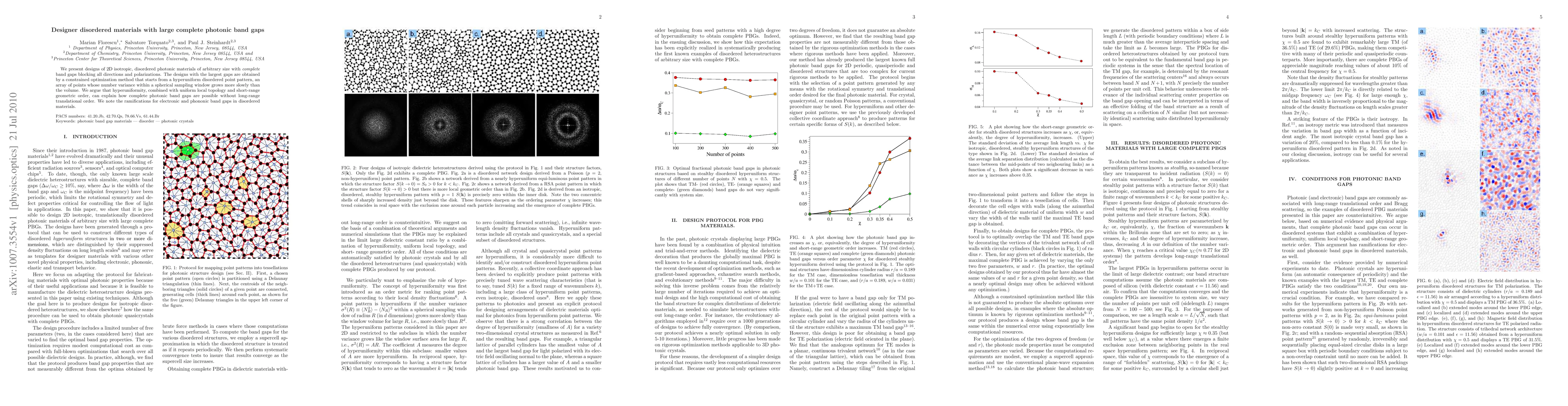 This paper designs 2D isotropic, disordered photonic materials with complete band gaps using a constrained optimization method starting from a hyperuniform disordered point pattern. The study argues that hyperuniformity, uniform local topology, and short-range geometric order enable complete photonic band gaps without long-range order.