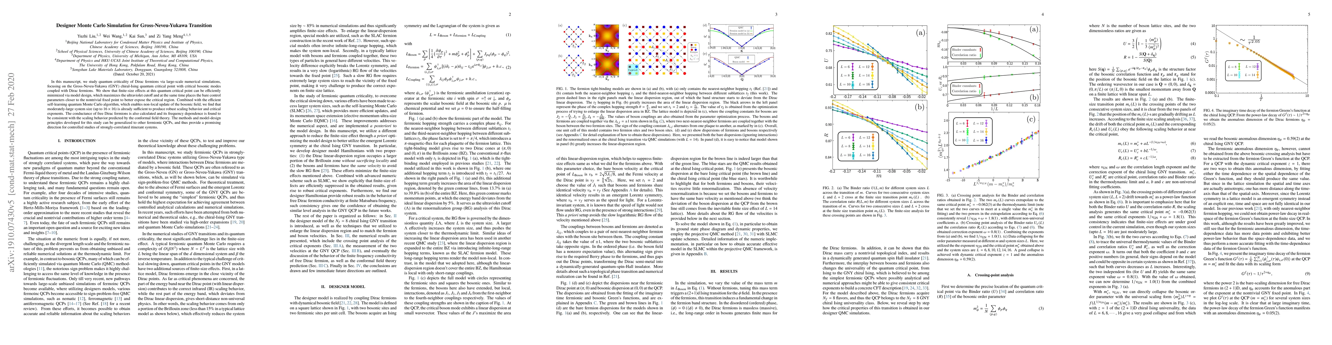 In this manuscript, we study quantum criticality of Dirac fermions via large-scale numerical simulations, focusing on the Gross-Neveu-Yukawa(GNY) chiral-Ising quantum critical point with critical bosonic modes coupled with Dirac fermions. We show that finite-size effects at this quantum critical point can be efficiently minimized via model design, which maximizes the ultraviolet cutoff and at the same time places the bare control parameters closer to the nontrivial fixed point to better expose the critical region. Combined with the efficient self-learning quantum Monte Carlo algorithm, which enables non-local update of the bosonic field, we find that moderately-large system size (up to $16\times 16$) is already sufficient to produce robust scaling behavior and critical exponents.The conductance of the Dirac fermions is also calculated and its frequency dependence is found to be consistent with the scaling behavior predicted by the conformal field theory. The methods and model-design principles developed for this study can be generalized to other fermionic QCPs, and thus provide a promising direction for controlled studies of strongly-correlated itinerant systems.
