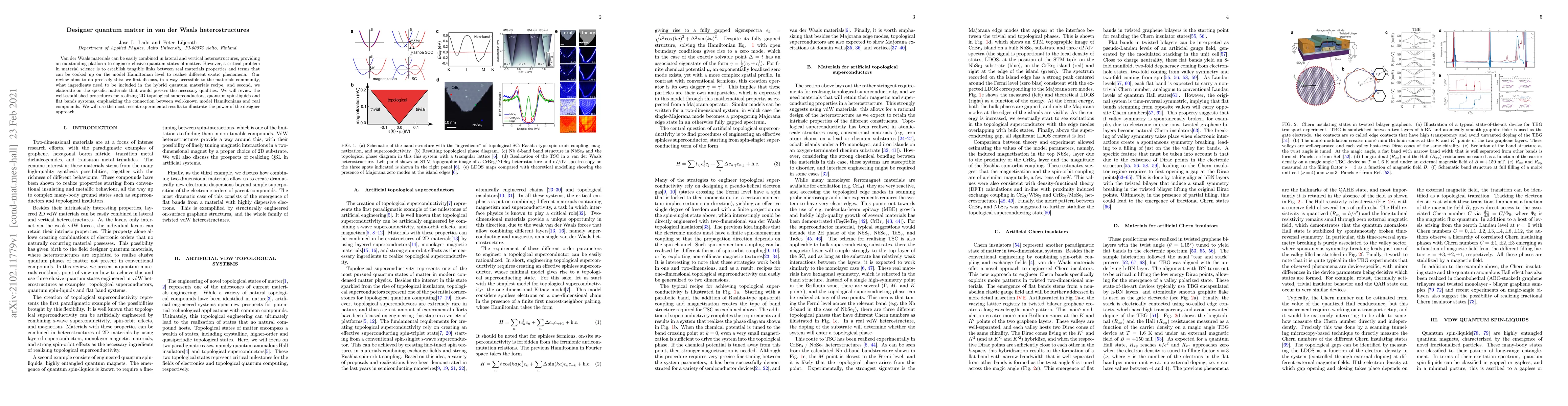 Van der Waals materials can be easily combined in lateral and vertical heterostructures, providing an outstanding platform to engineer elusive quantum states of matter. However, a critical problem in material science is to establish tangible links between real materials properties and terms that can be cooked up on the model Hamiltonian level to realize different exotic phenomena. Our review aims to do precisely this: we first discuss, in a way accessible to the materials community, what ingredients need to be included in the hybrid quantum materials recipe, and second, we elaborate on the specific materials that would possess the necessary qualities. We will review the well-established procedures for realizing 2D topological superconductors, quantum spin-liquids and flat bands systems, emphasizing the connection between well-known model Hamiltonians and real compounds. We will use the most recent experimental results to illustrate the power of the designer approach.