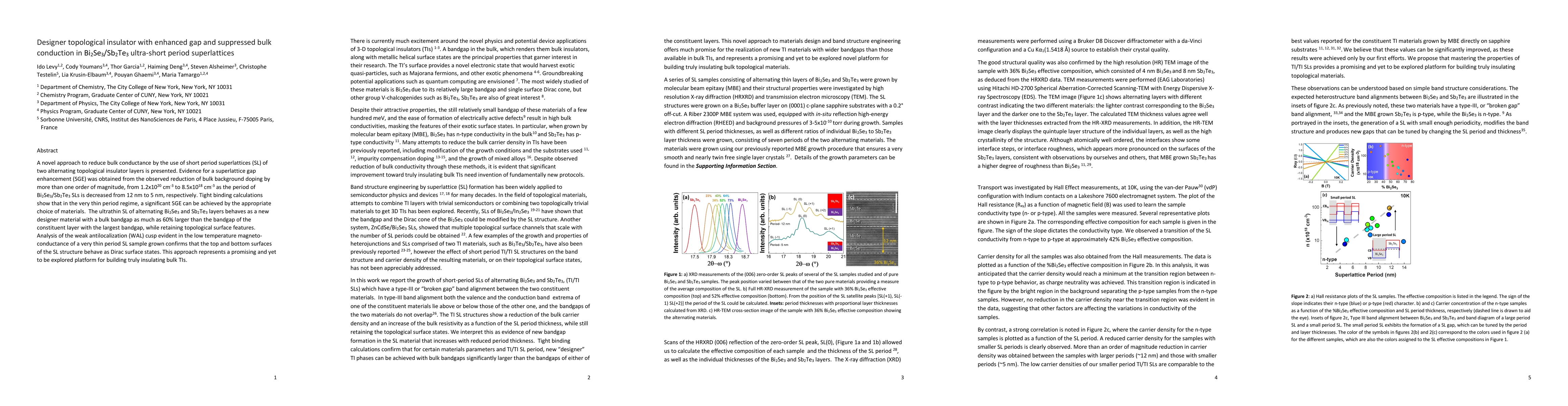 A novel approach to reduce bulk conductance by the use of short period superlattices (SL) of two alternating topological insulator layers is presented. Evidence for a superlattice gap enhancement (SGE) was obtained from the observed reduction of bulk background doping by more than one order of magnitude, from 1.2x1020 cm-3 to 8.5x1018 cm-3 as the period of Bi2Se3/Sb2Te3 SLs is decreased from 12 nm to 5 nm, respectively. Tight binding calculations show that in the very thin period regime, a significant SGE can be achieved by the appropriate choice of materials. The ultrathin SL of alternating Bi2Se3 and Sb2Te3 layers behaves as a new designer material with a bulk bandgap as much as 60% larger than the bandgap of the constituent layer with the largest bandgap, while retaining topological surface features. Analysis of the weak antilocalization (WAL) cusp evident in the low temperature magneto-conductance of a very thin period SL sample grown confirms that the top and bottom surfaces of the SL structure behave as Dirac surface states. This approach represents a promising and yet to be explored platform for building truly insulating bulk TIs.