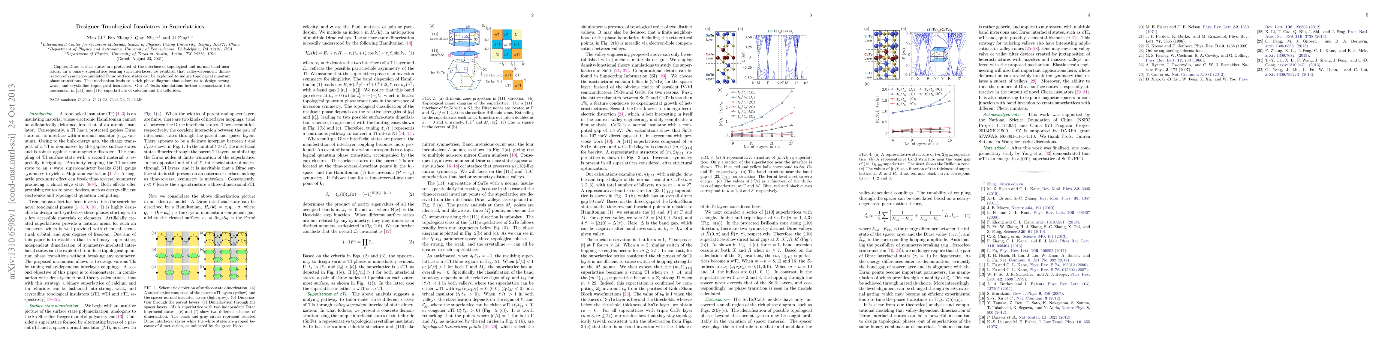 This paper explores how valley-dependent dimerization of Dirac surface states in superlattices can induce topological quantum phase transitions, leading to the design of strong, weak, and crystalline topological insulators, as demonstrated through ab initio simulations of calcium and tin telluride superlattices.