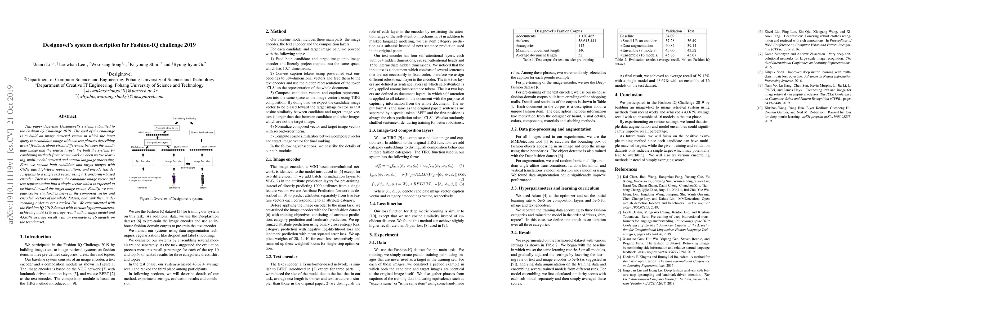 This paper describes Designovel's systems which are submitted to the Fashion IQ Challenge 2019. Goal of the challenge is building an image retrieval system where input query is a candidate image plus two text phrases describe user's feedback about visual differences between the candidate image and the search target. We built the systems by combining methods from recent work on deep metric learning, multi-modal retrieval and natual language processing. First, we encode both candidate and target images with CNNs into high-level representations, and encode text descriptions to a single text vector using Transformer-based encoder. Then we compose candidate image vector and text representation into a single vector which is exptected to be biased toward target image vector. Finally, we compute cosine similarities between composed vector and encoded vectors of whole dataset, and rank them in desceding order to get ranked list. We experimented with Fashion IQ 2019 dataset in various settings of hyperparameters, achieved 39.12% average recall by a single model and 43.67% average recall by an ensemble of 16 models on test dataset.