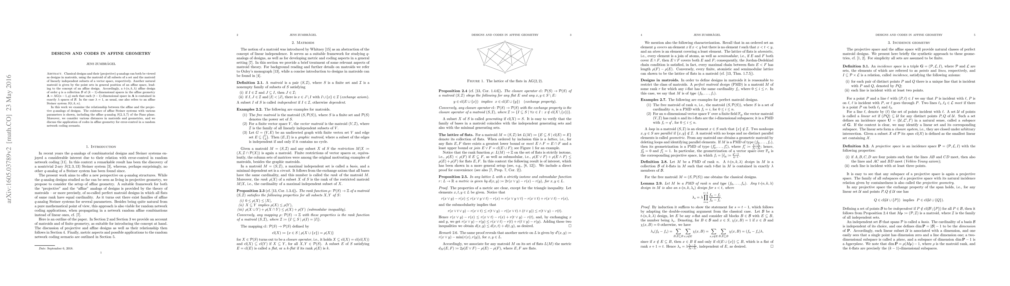Classical designs and their (projective) q-analogs can both be viewed as designs in matroids, using the matroid of all subsets of a set and the matroid of linearly independent subsets of a vector space, respectively. Another natural matroid is given by the point sets in general position of an affine space, leading to the concept of an affine design. Accordingly, a t-(n, k, $\lambda$) affine design of order q is a collection B of (k-1)-dimensional spaces in the affine geometry A = AG(n-1, q) such that each (t-1)-dimensional space in A is contained in exactly $\lambda$ spaces of B. In the case $\lambda$ = 1, as usual, one also refers to an affine Steiner system S(t, k, n). In this work we examine the relationship between the affine and the projective q-analogs of designs. The existence of affine Steiner systems with various parameters is shown, including the affine q-analog S(2, 3, 7) of the Fano plane. Moreover, we consider various distances in matroids and geometries, and we discuss the application of codes in affine geometry for error-control in a random network coding scenario.