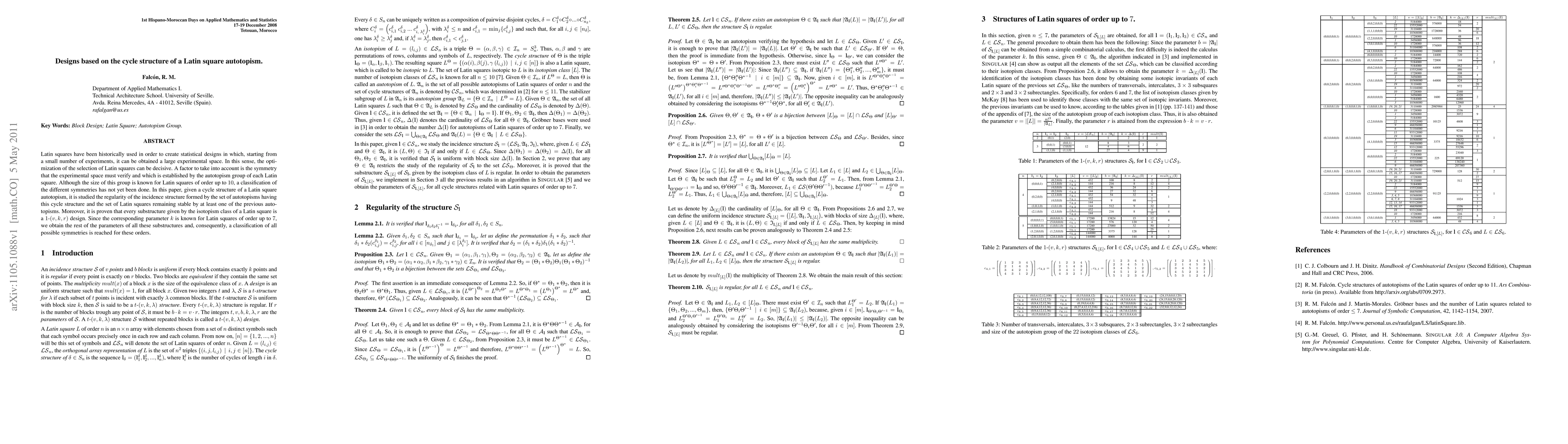 Latin squares have been historically used in order to create statistical designs in which, starting from a small number of experiments, it can be obtained a large experimental space. In this sense, the optimization of the selection of Latin squares can be decisive. A factor to take into account is the symmetry that the experimental space must verify and which is established by the autotopism group of each Latin square. Although the size of this group is known for Latin squares of order up to 10, a classification of the different symmetries has not yet been done. In this paper, given a cycle structure of a Latin square autotopism, it is studied the regularity of the incidence structure formed by the set of autotopisms having this cycle structure and the set of Latin squares remaining stable by at least one of the previous autotopisms. Moreover, it is proven that every substructure given by the isotopism class of a Latin square is a 1-$(v,k,r)$ design. Since the corresponding parameter $k$ is known for Latin squares of order up to 7, we obtain the rest of the parameters of all these substructures and, consequently, a classification of all possible symmetries is reached for these orders.