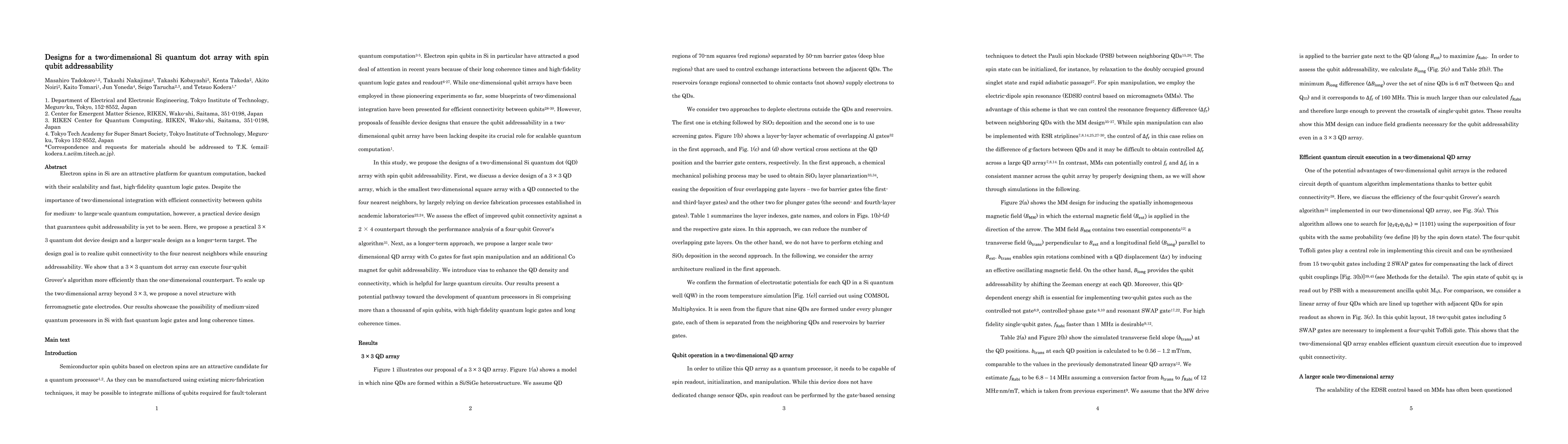 This paper proposes a practical 3 x 3 silicon quantum dot array design for scalable quantum computation, emphasizing qubit addressability and connectivity. The design enables efficient execution of four-qubit Grover's algorithm and suggests a scalable structure using ferromagnetic gate electrodes for larger arrays.