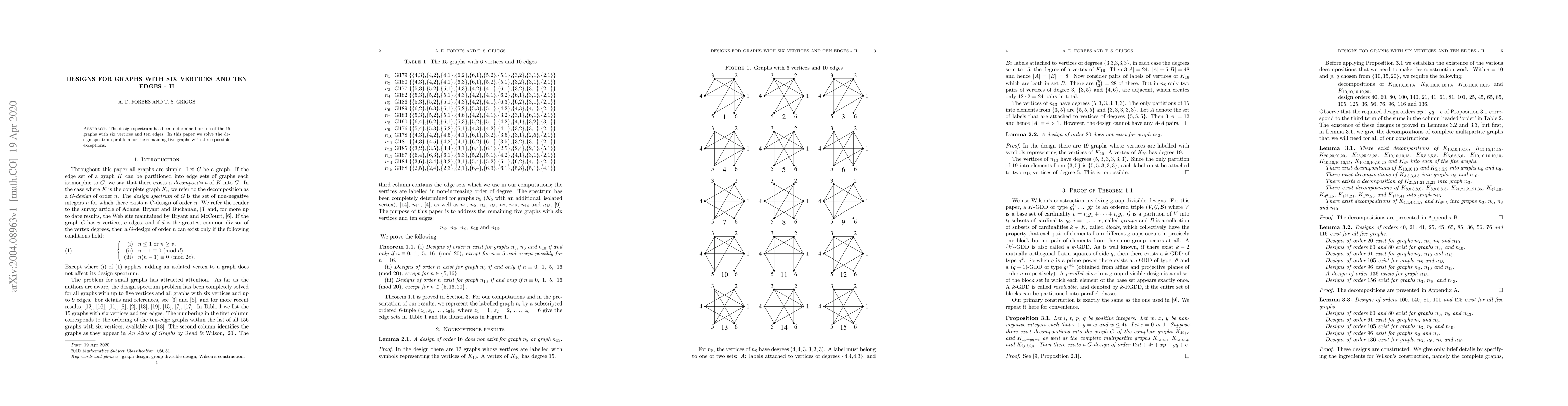 This paper completes the determination of the design spectrum for ten out of the fifteen possible graphs with six vertices and ten edges, solving the design spectrum problem for the remaining five graphs, with only three exceptions left unresolved.