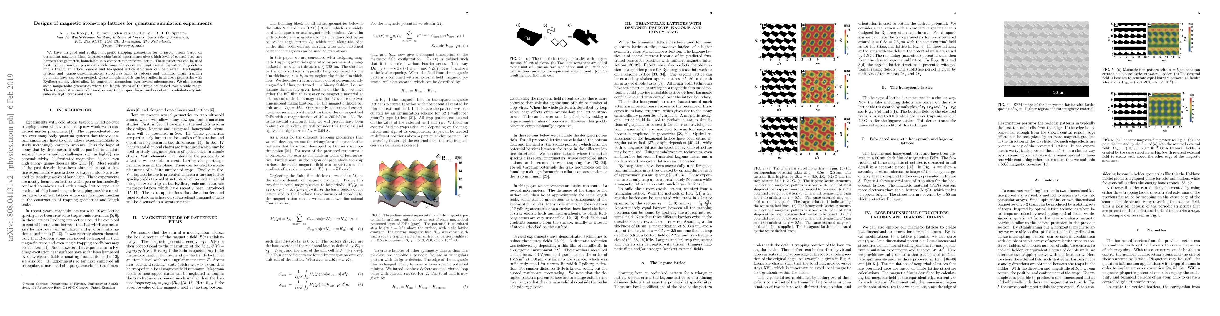 We have designed and realized magnetic trapping geometries for ultracold atoms based on permanent magnetic films. Magnetic chip based experiments give a high level of control over trap barriers and geometric boundaries in a compact experimental setup. These structures can be used to study quantum spin physics in a wide range of energies and length scales. By introducing defects into a triangular lattice, kagome and hexagonal lattice structures can be created. Rectangular lattices and (quasi-)one-dimensional structures such as ladders and diamond chain trapping potentials have also been created. Quantum spin models can be studied in all these geometries with Rydberg atoms, which allow for controlled interactions over several micrometers. We also present some nonperiodic geometries where the length scales of the traps are varied over a wide range. These tapered structures offer another way to transport large numbers of atoms adiabatically into subwavelength traps and back.