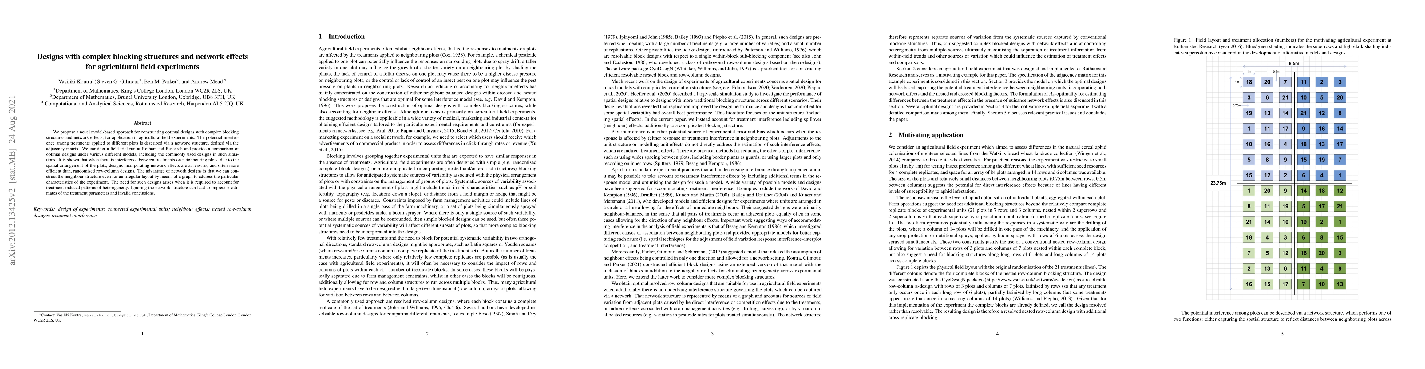 We propose a novel model-based approach for constructing optimal designs with complex blocking structures and network effects, for application in agricultural field experiments. The potential interference among treatments applied to different plots is described via a network structure, defined via the adjacency matrix. We consider a field trial run at Rothamsted Research and provide a comparison of optimal designs under various different models, including the commonly used designs in such situations. It is shown that when there is interference between treatments on neighbouring plots, due to the spatial arrangement of the plots, designs incorporating network effects are at least as, and often more efficient than, randomised row-column designs. The advantage of network designs is that we can construct the neighbour structure even for an irregular layout by means of a graph to address the particular characteristics of the experiment. The need for such designs arises when it is required to account for treatment-induced patterns of heterogeneity. Ignoring the network structure can lead to imprecise estimates of the treatment parameters and invalid conclusions.