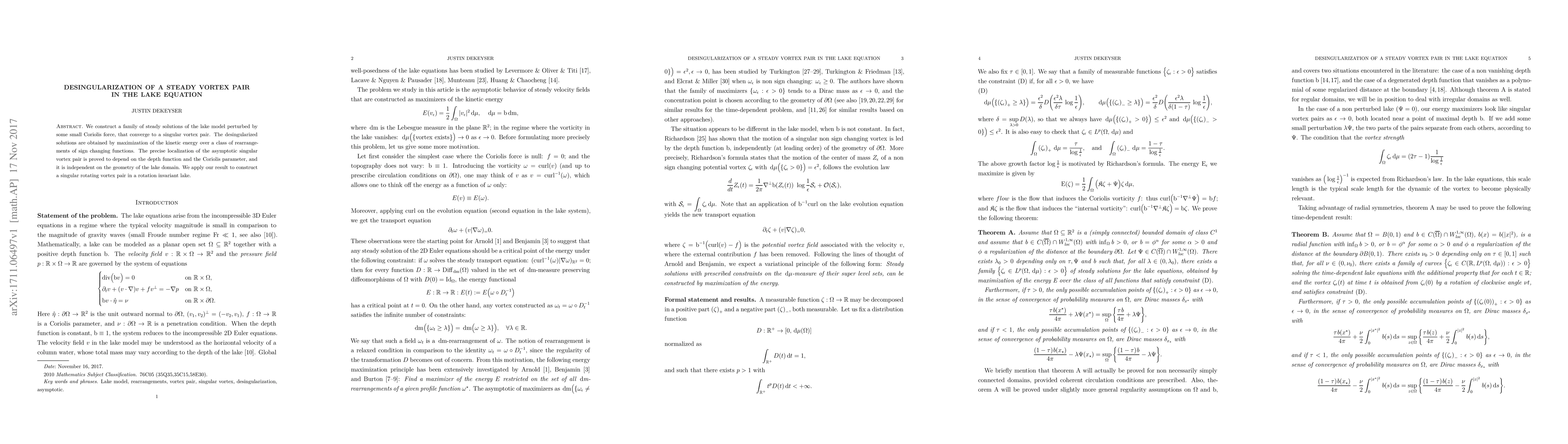 This paper constructs desingularized steady solutions of the lake equation perturbed by a small Coriolis force, converging to a singular vortex pair, achieved through kinetic energy maximization. The precise localization of these solutions depends on the depth function and Coriolis parameter, not on the lake's geometry.