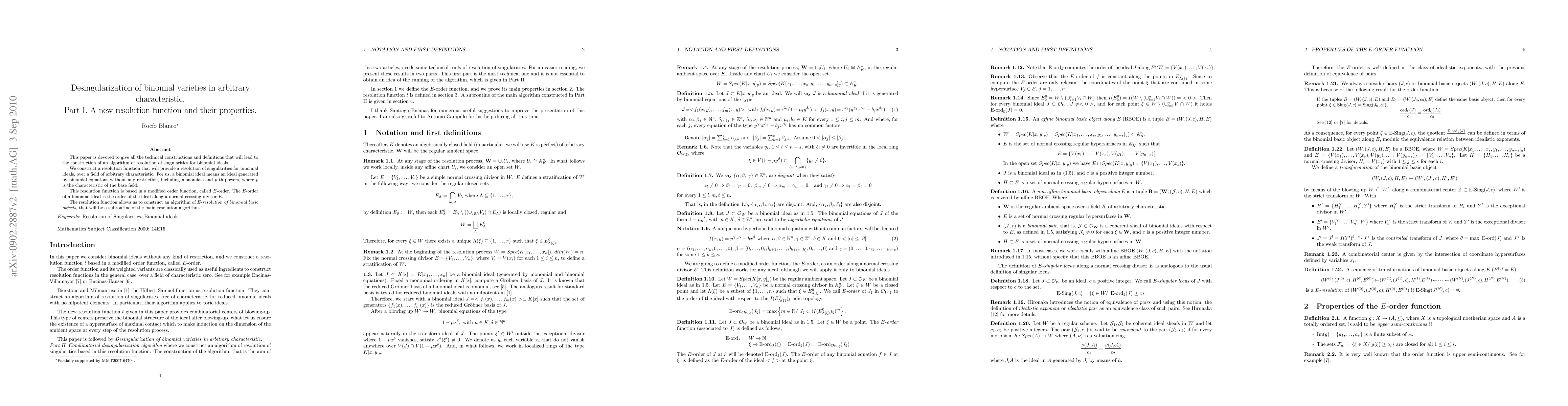 This paper is devoted to give all the technical constructions and definitions that will lead to the construction of an algorithm of resolution of singularities for binomial ideals. We construct a resolution function that will provide a resolution of singularities for binomial ideals, over a field of arbitrary characteristic. For us, a binomial ideal means an ideal generated by binomial equations without any restriction, including monomials and $p$-th powers, where $p$ is the characteristic of the base field. This resolution function is based in a modified order function, called $E$-order. The $E$-order of a binomial ideal is the order of the ideal along a normal crossing divisor $E$. The resolution function allows us to construct an algorithm of $E$-\emph{resolution of binomial basic objects}, that will be a subroutine of the main resolution algorithm.
