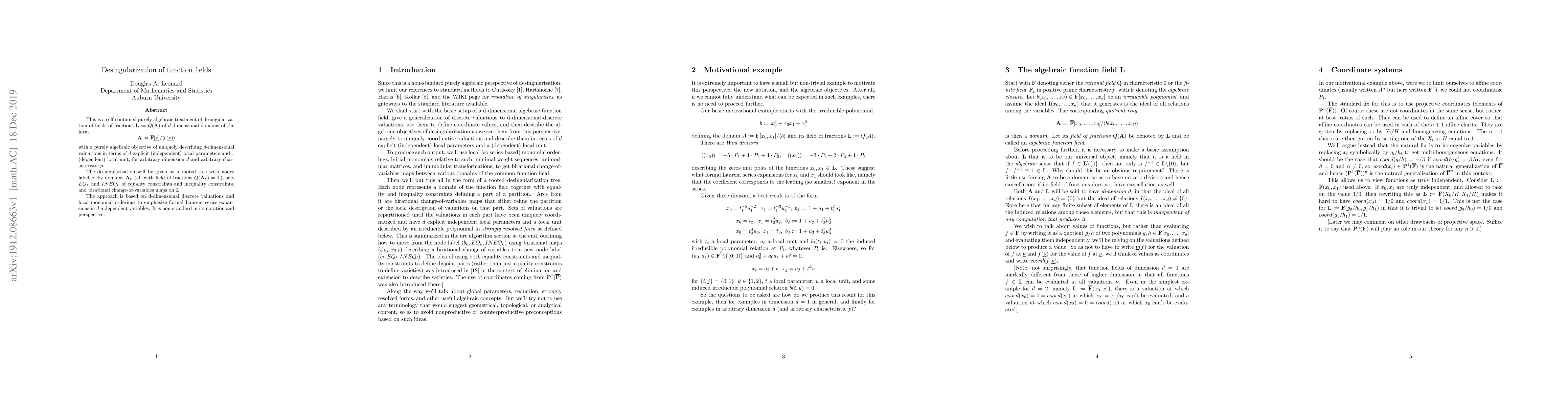 This is a self-contained purely algebraic treatment of desingularization of fields of fractions $\mathbf{L}:=Q(\mathbf{A})$ of $d$-dimensional domains of the form \[\mathbf{A}:=\bar{\mathbf{F}}[\underline{x}]/\langle b(\underline{x})\rangle\] with a purely algebraic objective of uniquely describing $d$-dimensional valuations in terms of $d$ explicit (independent) local parameters and $1$ (dependent) local unit, for arbitrary dimension $d$ and arbitrary characteristic $p$. The desingularization will be given as a rooted tree with nodes labelled by domains $\mathbf{A}_k$ (all with field of fractions $Q(\mathbf{A}_k)=\mathbf{L}$), sets $EQ_k$ and $INEQ_k$ of equality constraints and inequality constraints, and birational change-of-variables maps on $\mathbf{L}$. The approach is based on d-dimensional discrete valuations and local monomial orderings to emphasize formal Laurent series expansions in $d$ independent variables. It is non-standard in its notation and perspective.