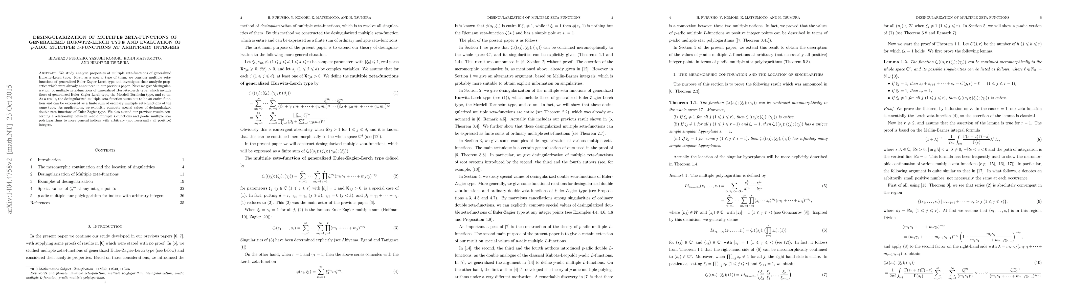 This paper investigates the analytic properties and desingularization of multiple zeta-functions of generalized Hurwitz-Lerch type, establishing them as entire functions. It also computes special values of desingularized double zeta-functions and extends the relationship between $p$-adic multiple $L$-functions and $p$-adic multiple star polylogarithms to general indices.
