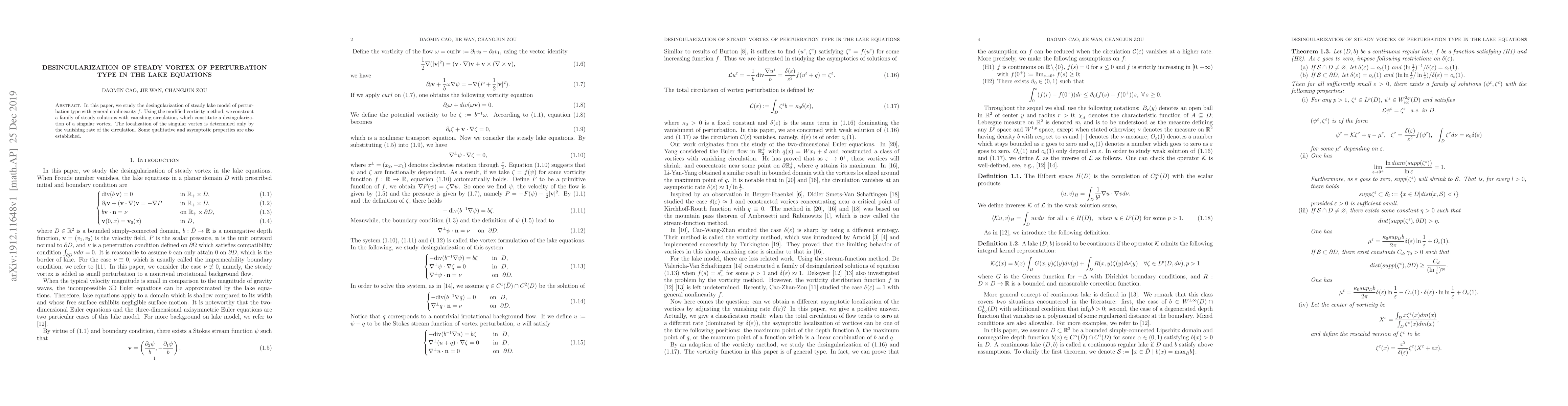 In this paper, we study the desingularization of steady lake model of perturbation type with general nonlinearity f. Using the modified vorticity method, we construct a family of steady solutions with vanishing circulation, which constitute a desingularization of a singular vortex. The localization of the singular vortex is determined only by the vanishing rate of the circulation. Some qualitative and asymptotic properties are also established.