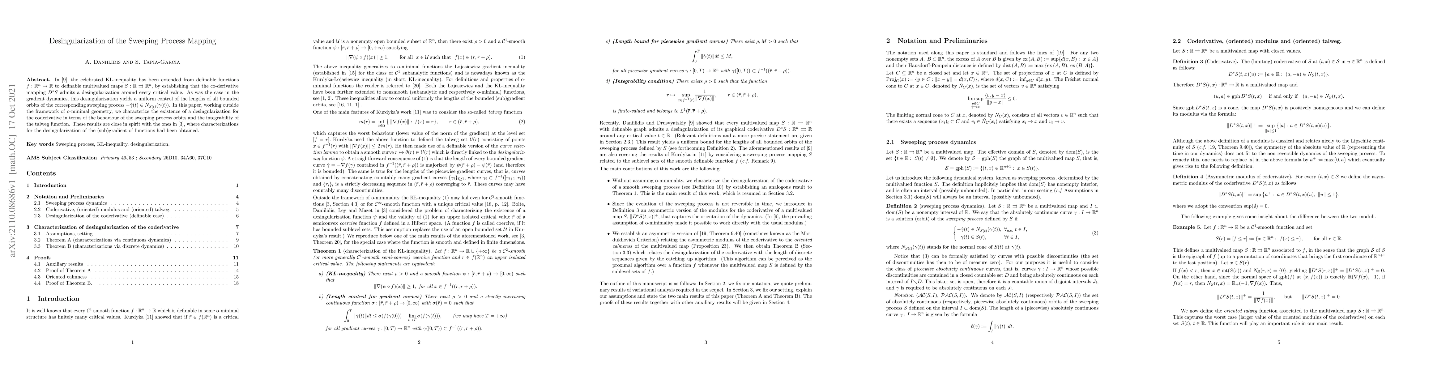 In [9], the celebrated K{\L}-inequality has been extended from definable functions $f:\mathbb{R}^{n}\rightarrow\mathbb{R} $ to definable multivalued maps $S:\mathbb{R}\rightrightarrows\mathbb{R}^{n}$, by establishing that the co-derivative mapping $D^{\ast}S$ admits a desingularization around every critical value. As was the case in the gradient dynamics, this desingularization yields a uniform control of the lengths of all bounded orbits of the corresponding sweeping process $-\dot{\gamma}(t)\in N_{S(t)}(\gamma(t))$. In this paper, working outside the framework of o-minimal geometry, we characterize the existence of a desingularization for the coderivative in terms of the behaviour of the sweeping process orbits and the integrability of the talweg function. These results are close in spirit with the ones in [3], where characterizations for the desingularization of the (sub)gradient of functions had been obtained.