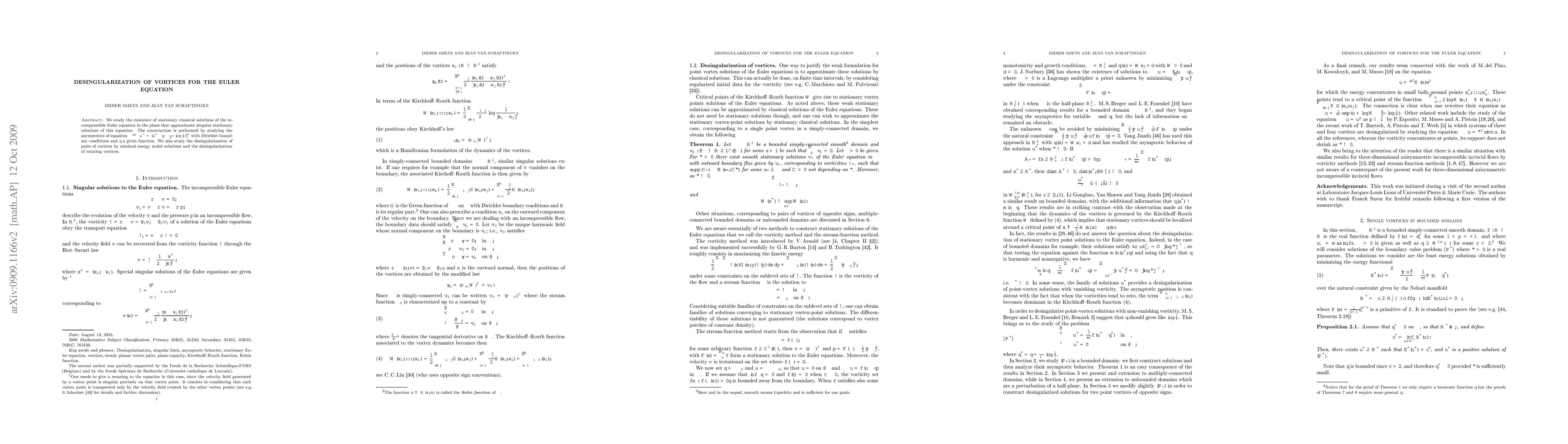 We study the existence of stationary classical solutions of the incompressible Euler equation in the plane that approximate singular stationnary solutions of this equation. The construction is performed by studying the asymptotics of equation $-\eps^2 \Delta u^\eps=(u^\eps-q-\frac{\kappa}{2\pi} \log \frac{1}{\eps})_+^p$ with Dirichlet boundary conditions and $q$ a given function. We also study the desingularization of pairs of vortices by minimal energy nodal solutions and the desingularization of rotating vortices.