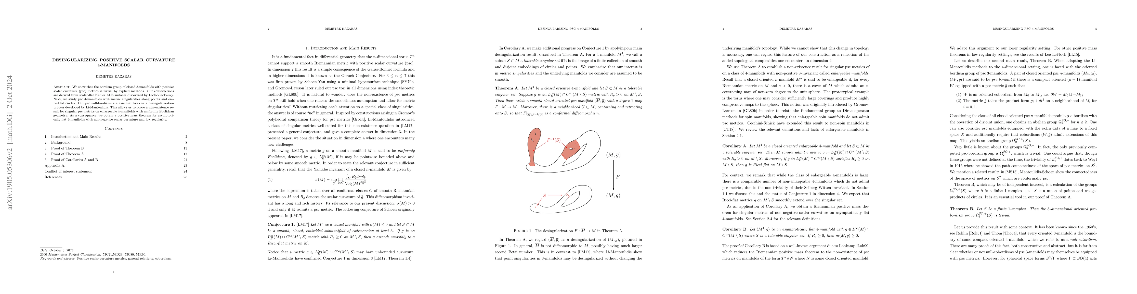 The paper uses explicit methods to show that the bordism group of closed 3-manifolds with positive scalar curvature (psc) metrics is trivial. It also employs scalar-flat Kähler ALE surfaces discovered by Lock-Viaclovsky and develops a desingularization process by Li-Mantoulidis to prove a non-existence result for singular psc metrics.