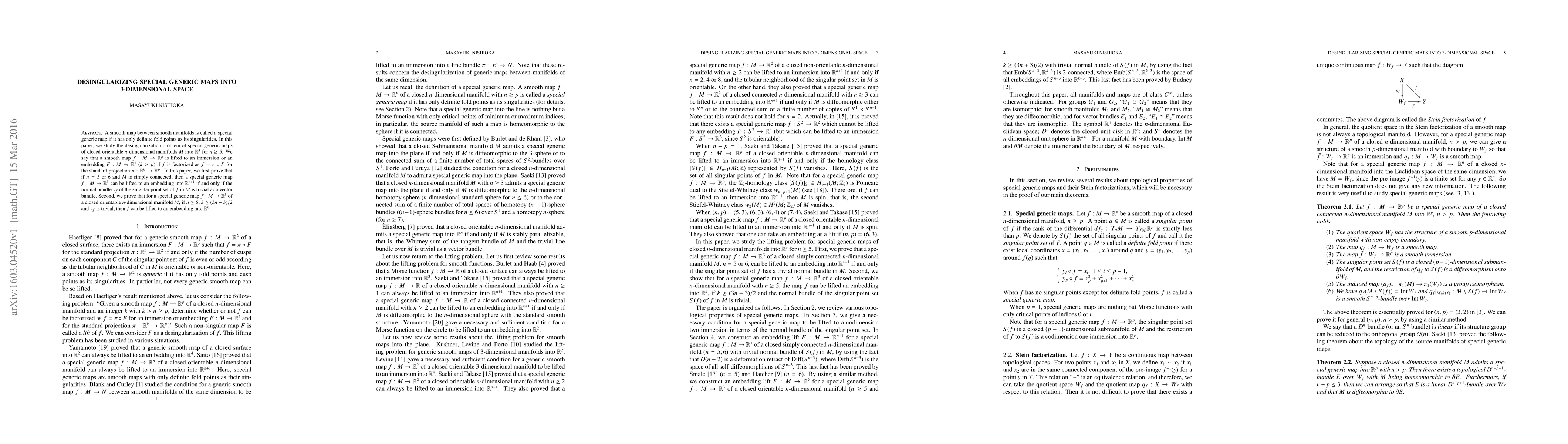 This paper establishes conditions for desingularizing special generic maps into 3D space by expressing them as compositions of embeddings and projections under specific dimensional constraints. The focus is on maps with only fold singularities.