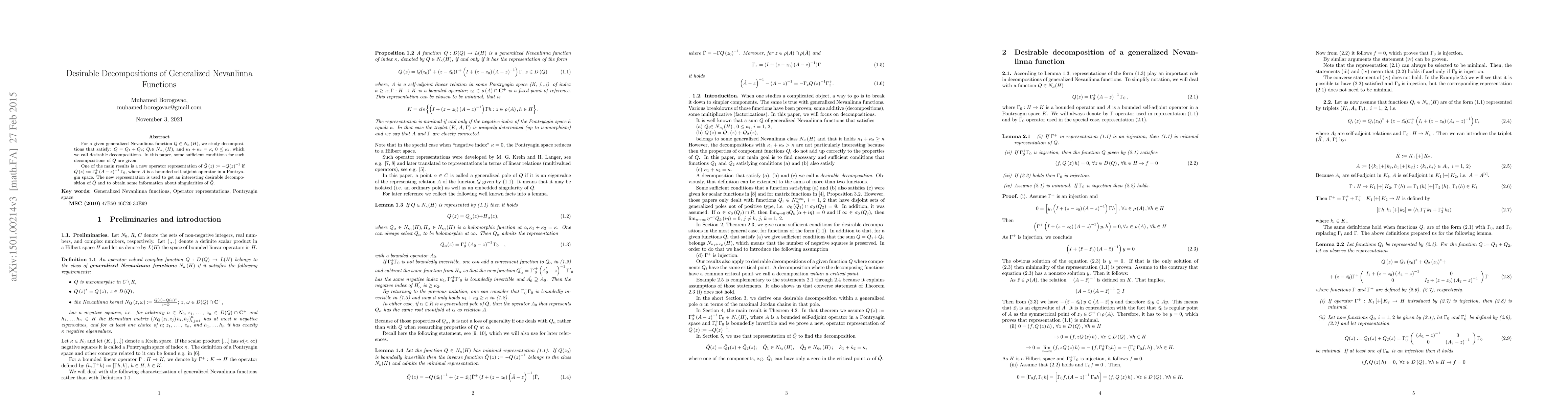 The research methodology involves studying desirable decompositions of generalized Nevanlinna functions represented by Q(z) = Γ+0(A - z)^-1Γ0, where A is a bounded self-adjoint operator in a Pontryagin space, and examining conditions for such decompositions.