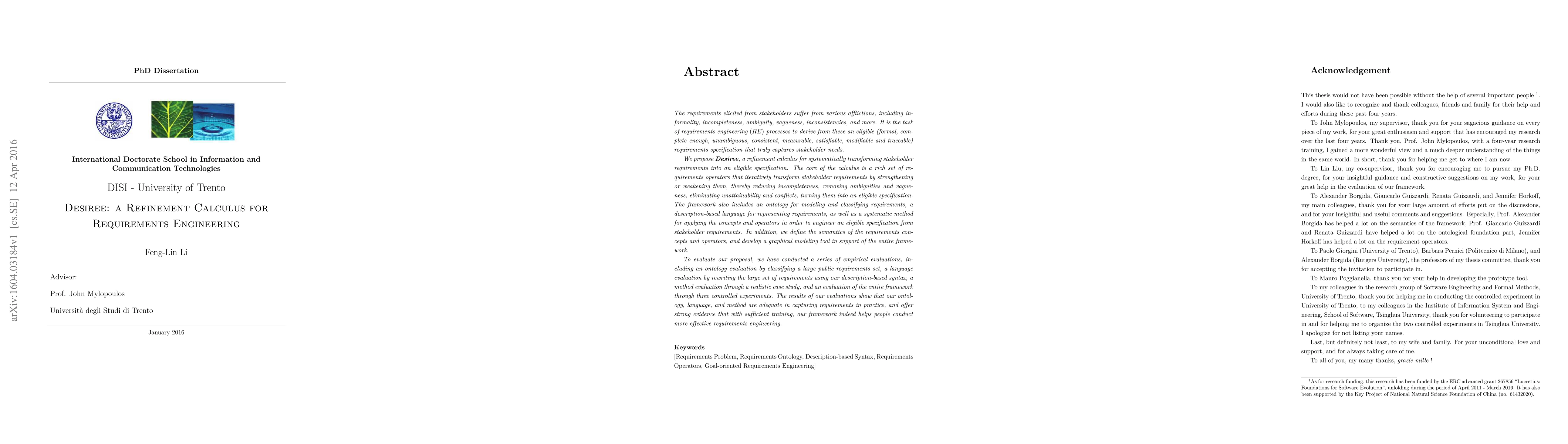 Desiree is a refinement calculus designed to transform informal stakeholder requirements into a formal, complete, and consistent specification. It employs a set of requirements operators and an ontology to systematically address issues like incompleteness and ambiguity, supported by empirical evaluations demonstrating its effectiveness in practice.