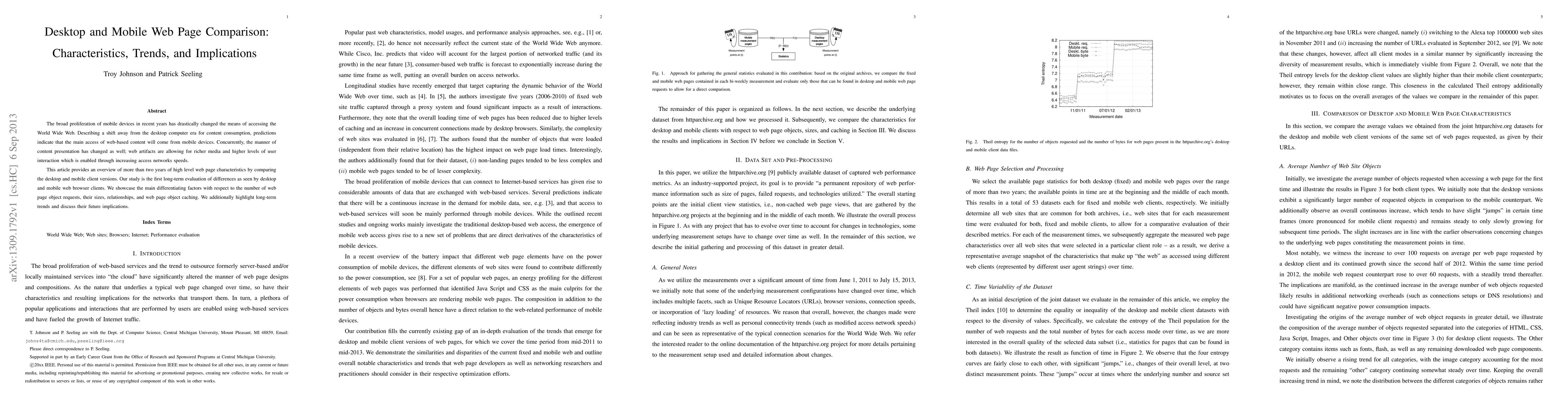 This study compares desktop and mobile web page characteristics over 2 years, highlighting differences in object requests, sizes, caching, and trends that indicate a shift towards mobile device access for web content.