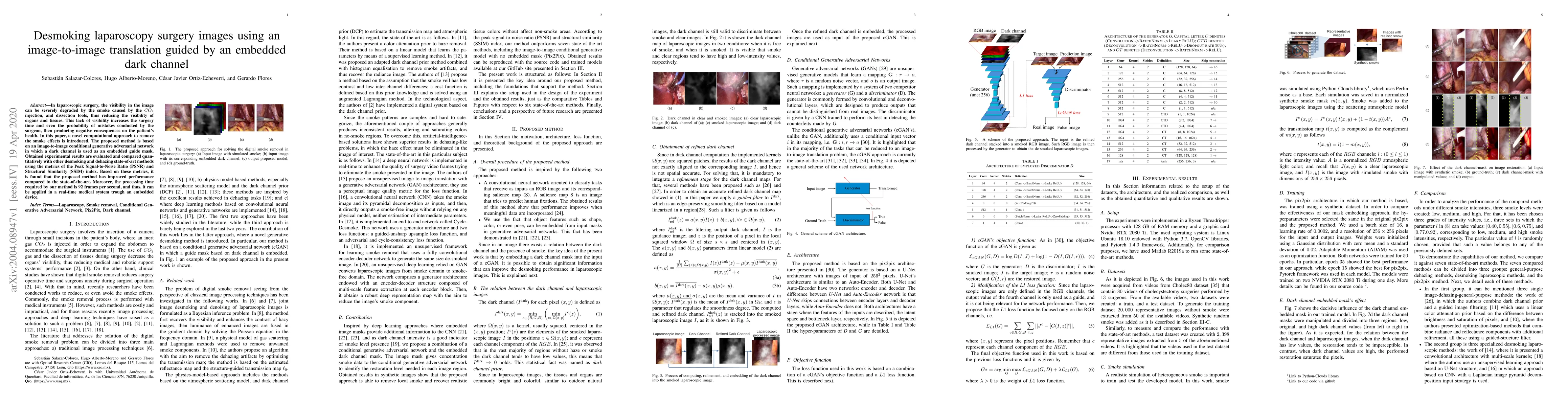 This paper introduces a novel method using an image-to-image conditional generative adversarial network to remove smoke from laparoscopic surgery images, guided by an embedded dark channel. Experimental results show superior performance compared to other desmoking methods, with a real-time processing speed of 92 frames per second.